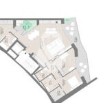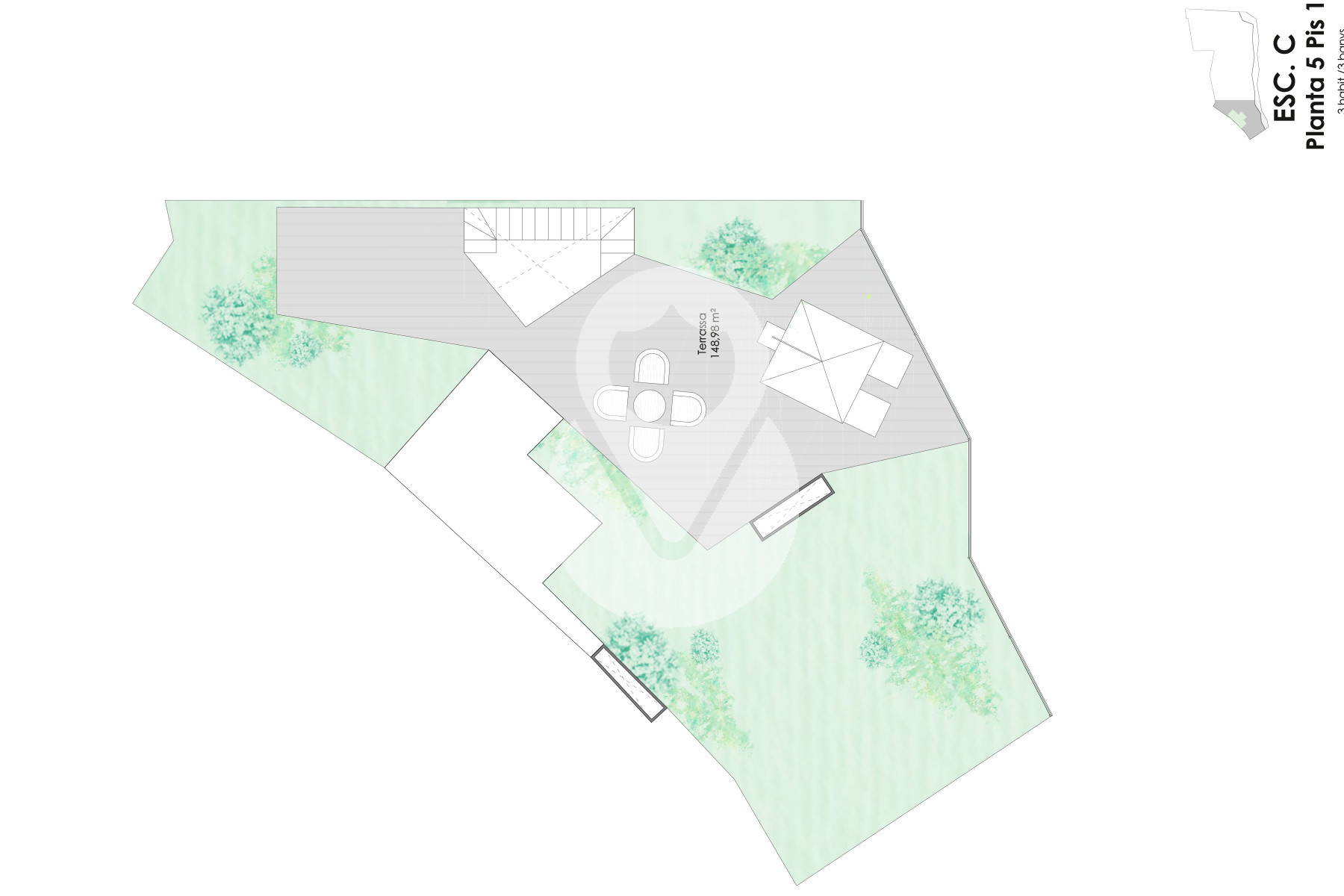 El piso tiene 310,42m² distribuidos en un gran salón comedor con doble acceso a una terraza de 173,97m², una amplia cocina, integrada en el comedor, equipada con electrodomésticos de gama alta. En la zona de descanso hay 3 habitaciones, una de ellas mastersuite con vestidor y salida a terraza, la segunda es en suite y otra individual. Esta última con acceso a la terraza trasera, orientada a oeste. Todas las habitaciones tienen armarios empotrados. También hay un tercer baño completo.