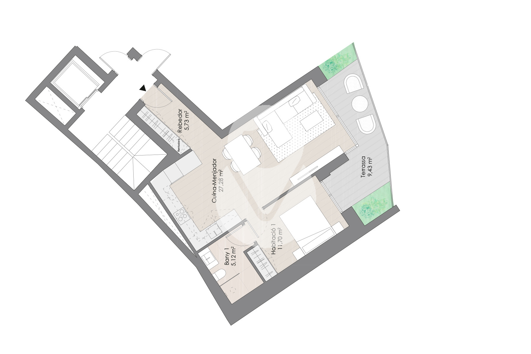 El piso tiene 71,17m² distribuidos en un gran salón comedor con acceso a una terraza de 9,43m², una amplia cocina, integrada en el comedor, equipada con electrodomésticos de gama alta. En la zona de descanso hay 1 habitación con armarios empotrados y acceso a la terraza. También hay un baño completo.