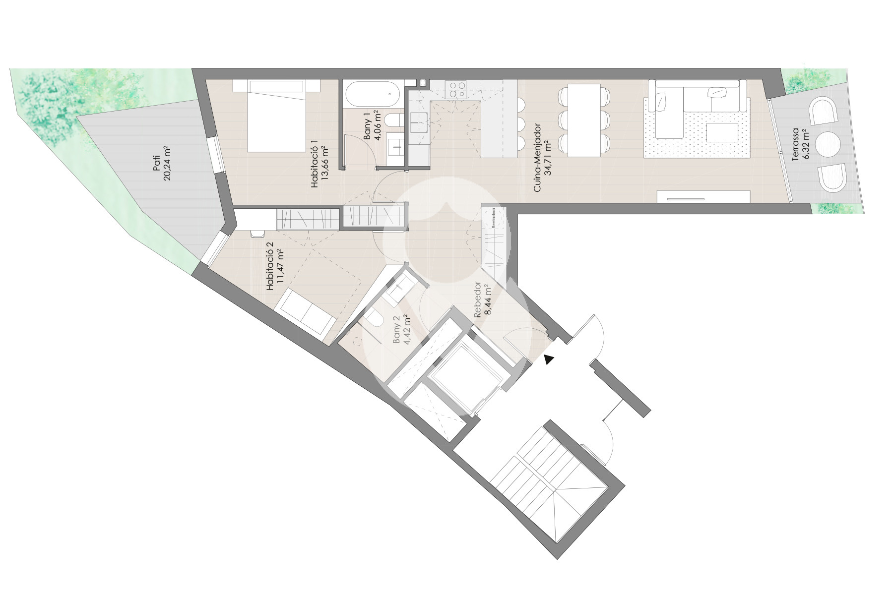 El piso tiene 120m² distribuidos en un gran salón comedor con acceso a una terraza de 26m², una amplia cocina, integrada en el comedor, equipada con electrodomésticos de gama alta. En la zona de descanso hay 2 habitaciones, una de ellas en suite con baño completo, otra individual, y ambas con armarios empotrados. También hay un segundo baño completo.