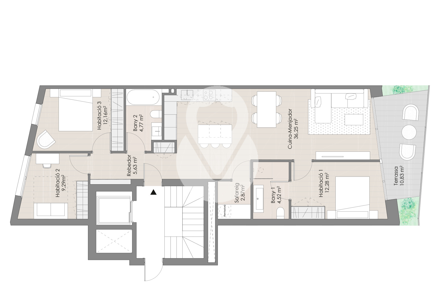 El piso tiene 112m² distribuidos en un gran salón comedor con acceso a una terraza de 10m², una amplia cocina, integrada en el comedor, equipada con electrodomésticos de gama alta, con sala de lavandería independiente. En la zona de descanso hay 3 habitaciones, una de ellas en suite con baño completo, una doble y otra individual, y las tres con armarios empotrados. También hay un segundo baño completo.