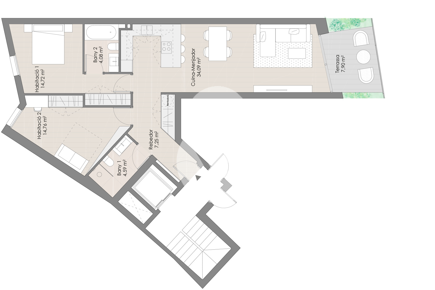 El piso tiene 101,79m² distribuidos en un gran salón comedor con acceso a una terraza de 7,90m², una amplia cocina, integrada en el comedor, equipada con electrodomésticos de gama alta. En la zona de descanso hay 2 habitaciones, una de ellas en suite con baño completo, otra individual, y ambas con armarios empotrados. También hay un segundo baño completo.