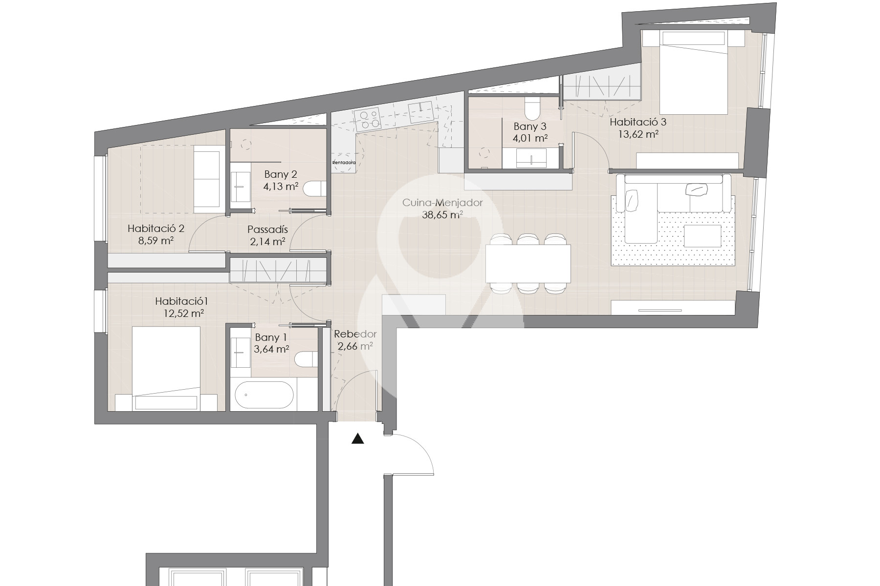 El piso tiene 107,58m² distribuidos en un gran salón comedor, una amplia cocina, integrada en el comedor, equipada con electrodomésticos de gama alta. En la zona de descanso hay 3 habitaciones, 2 de ellas dobles en suite, otra individual, y las tres con armarios empotrados. La propiedad tiene 3 baños completos.