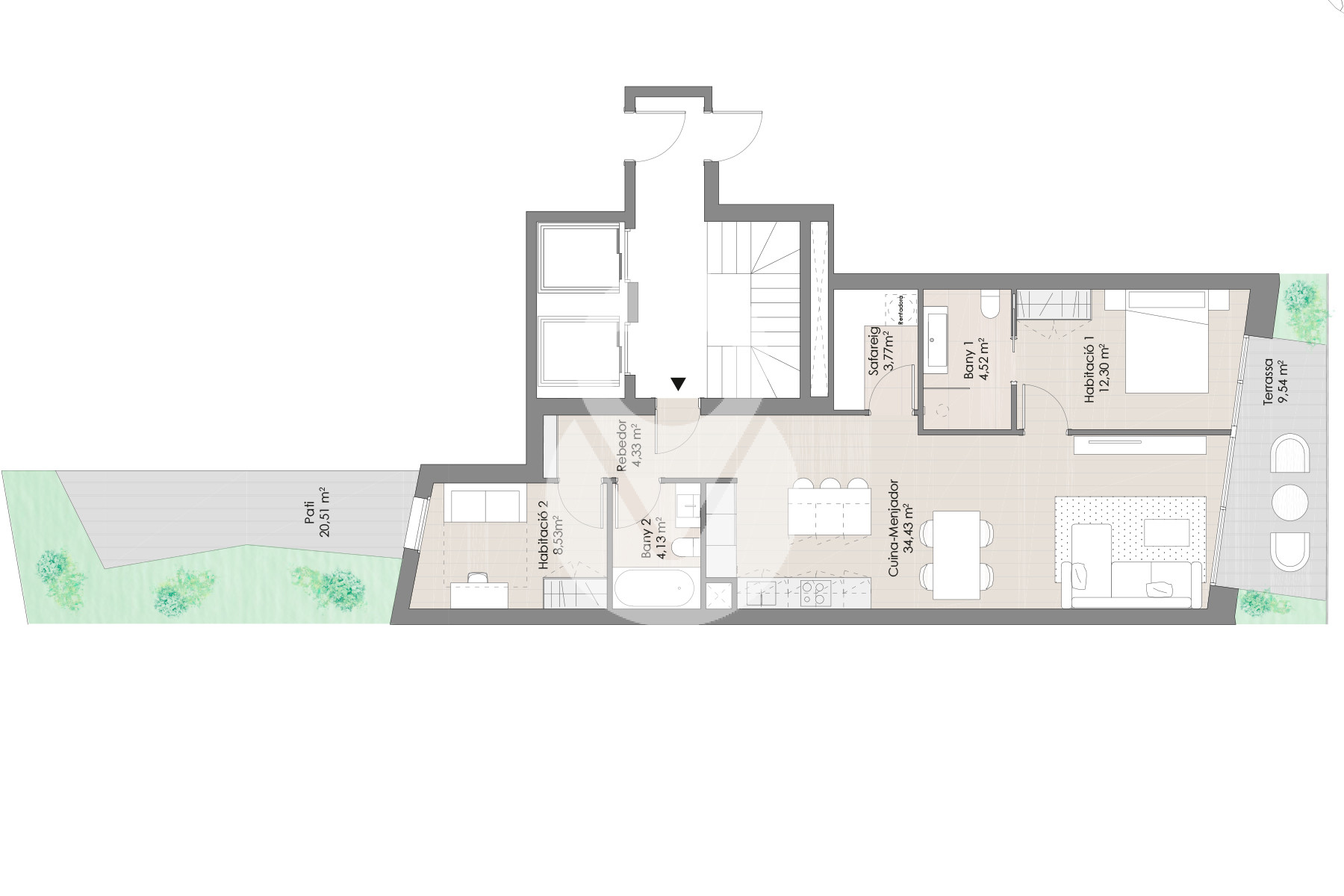 El piso tiene 113m² distribuidos en un gran salón comedor con acceso a una terraza de 30m², una amplia cocina, integrada en el comedor, equipada con electrodomésticos de gama alta, con sala de lavandería independiente. En la zona de descanso hay 2 habitaciones, una de ellas en suite con baño completo, otra individual, y ambas con armarios empotrados. También hay un segundo baño completo.