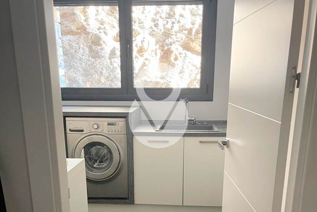 La primera planta consta de un magnífico salón comedor con una moderna chimenea, sobre un banco de piedra hecho a medida que actúa como prenda, y rodeado de grandes ventanales que dan mucha luz natural a este espacio, y con salida a un gran balcón y en el patio. La parte de comedor formal de la sala conecta con una espaciosa cocina de diseño e independiente, totalmente equipada, con muchos espacios de trabajo y almacenamiento, electrodomésticos integrados y salida directa al patio. También en esta planta, encontramos un dormitorio doble con armarios empotrados, un baño completo con ducha, y completando esta planta, una sala de lavandería.