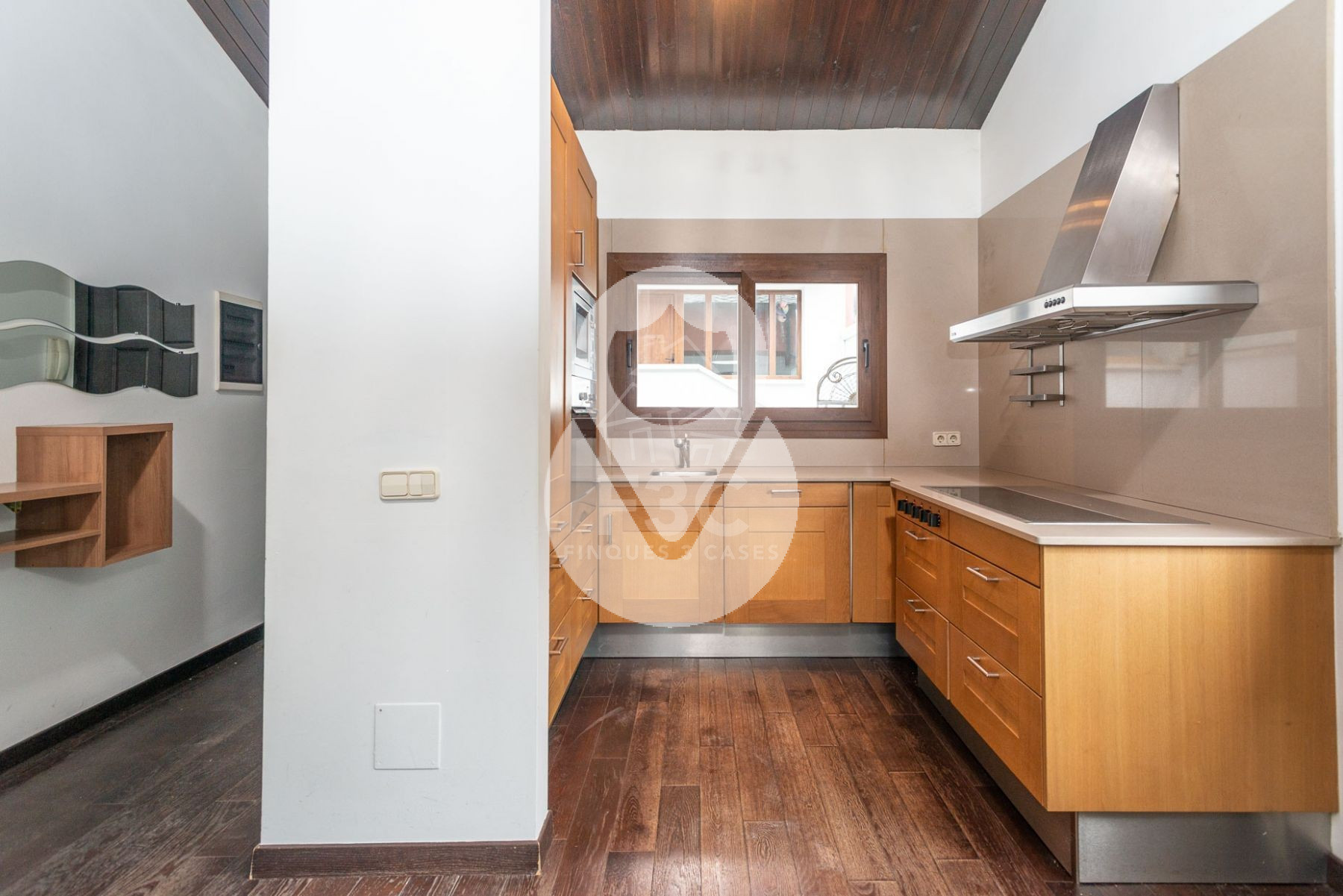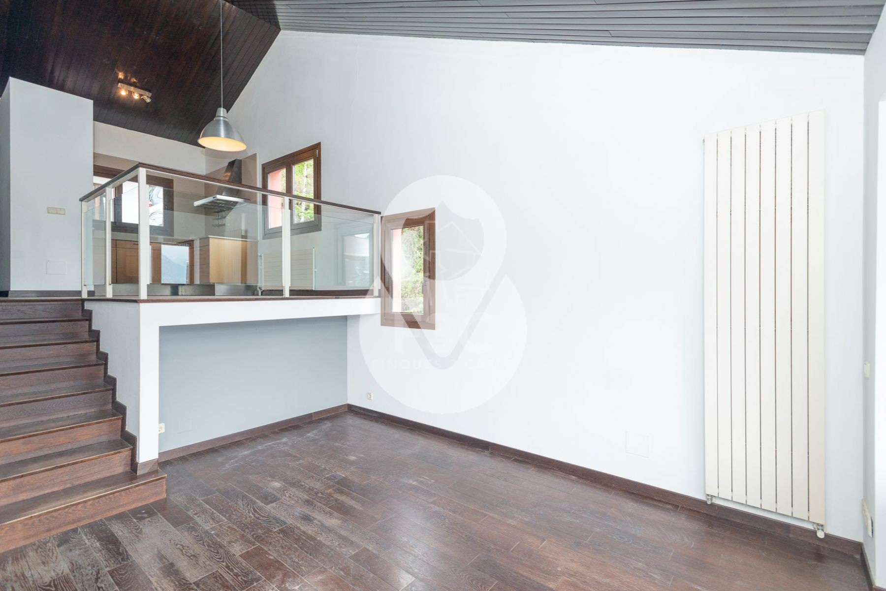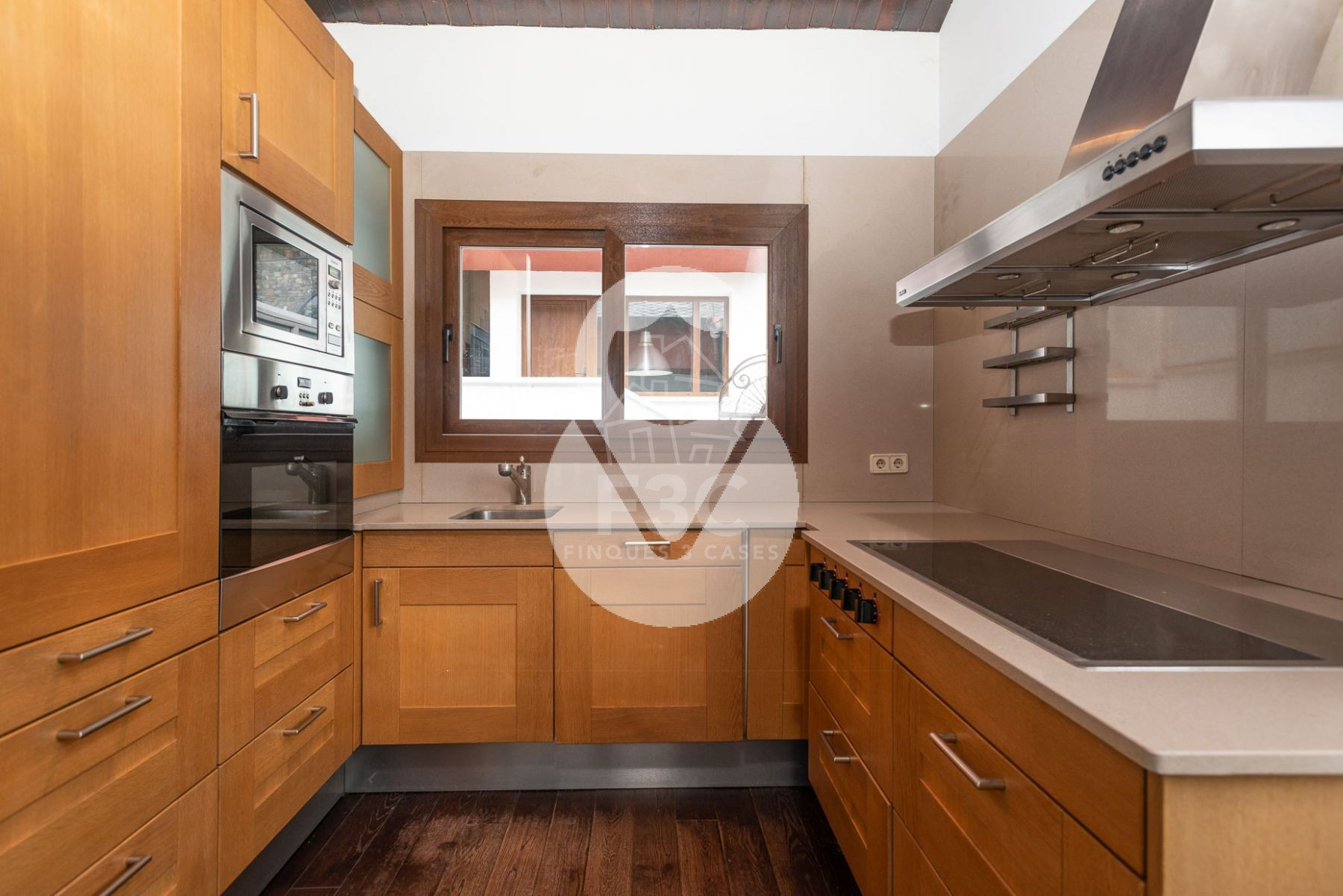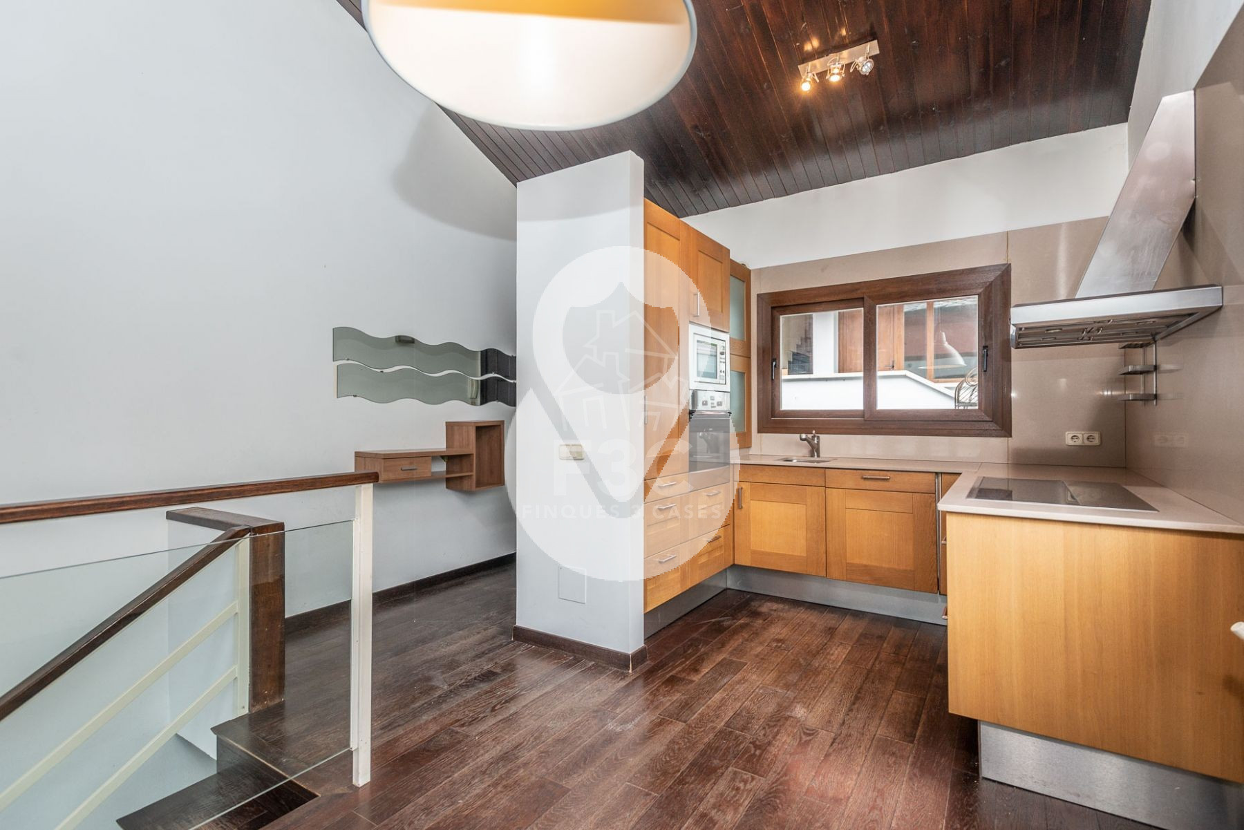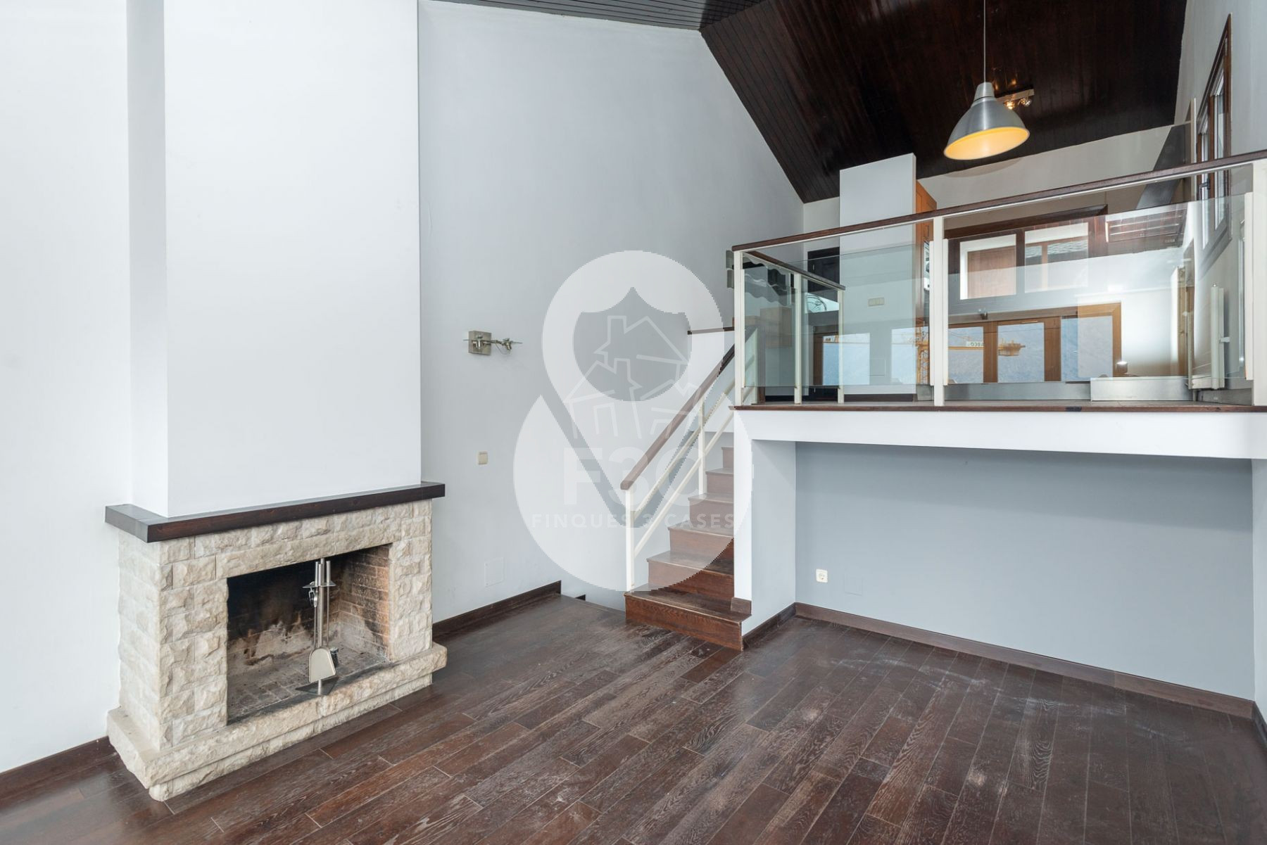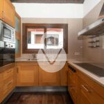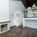 El edificio residencial dispone en su planta superior, bajo techos altos recubiertos de madera, de un espacioso salón-comedor de 2 niveles, una cocina moderna abierta y totalmente equipada con encimeras de cuarzo, chimenea funcional y acceso a un bonito balcón cubierto desde el cual disfrutar de las vistas y del sol.