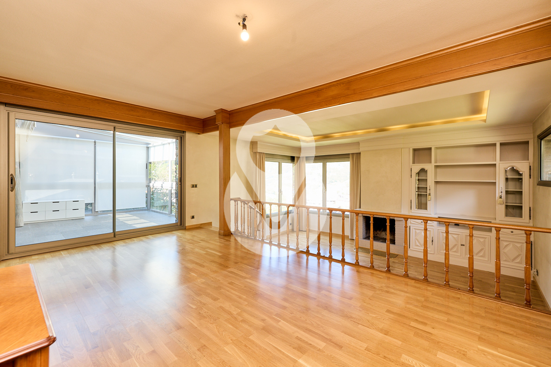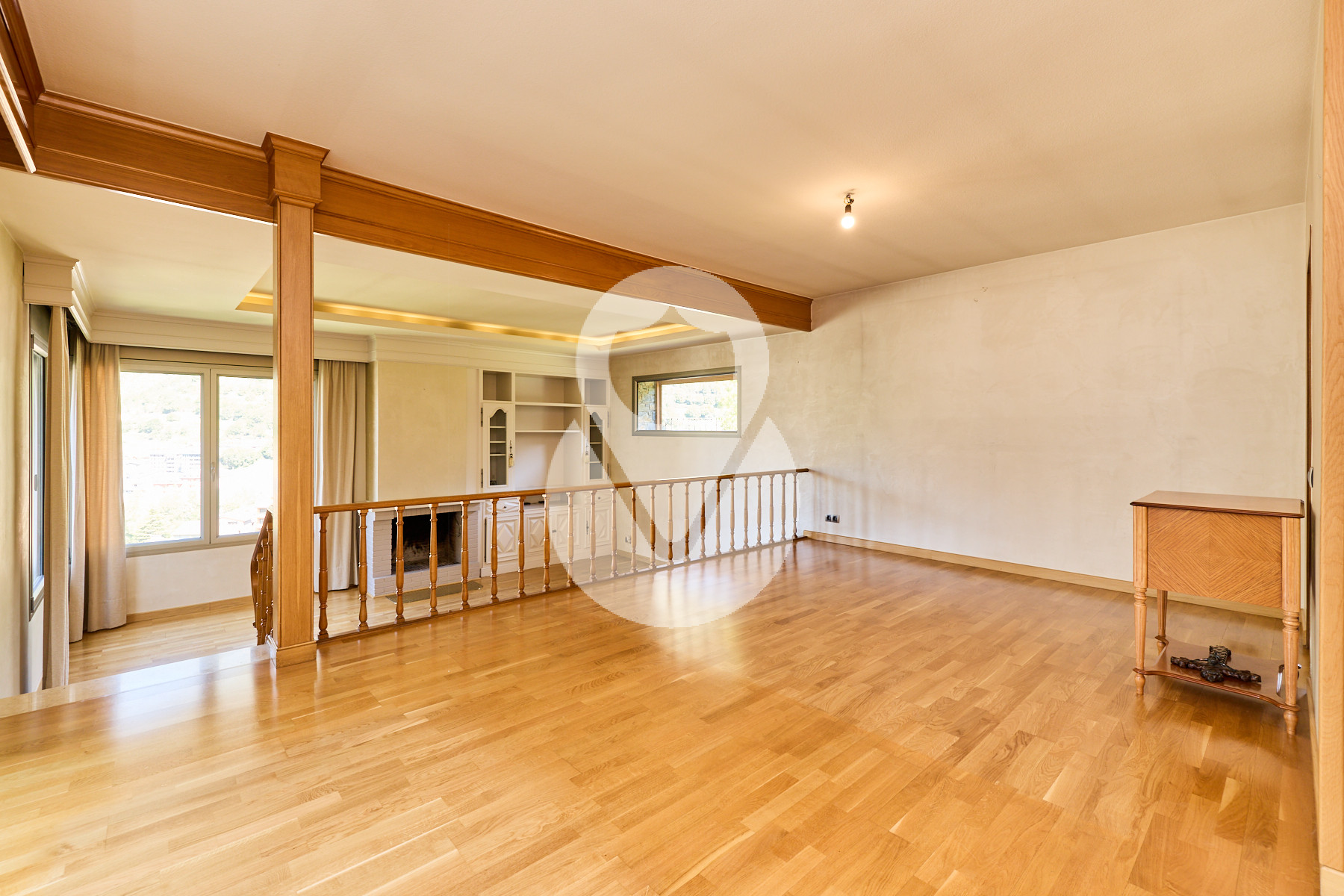 El salón-comedor se distribuye en dos niveles, diferenciando la zona de comedor de la zona de estar, con grandes ventanales que aportan mucha luz natural. Dispone de chimenea de leña y una ventana panorámica con vistas a Sant Romà de les Bons.