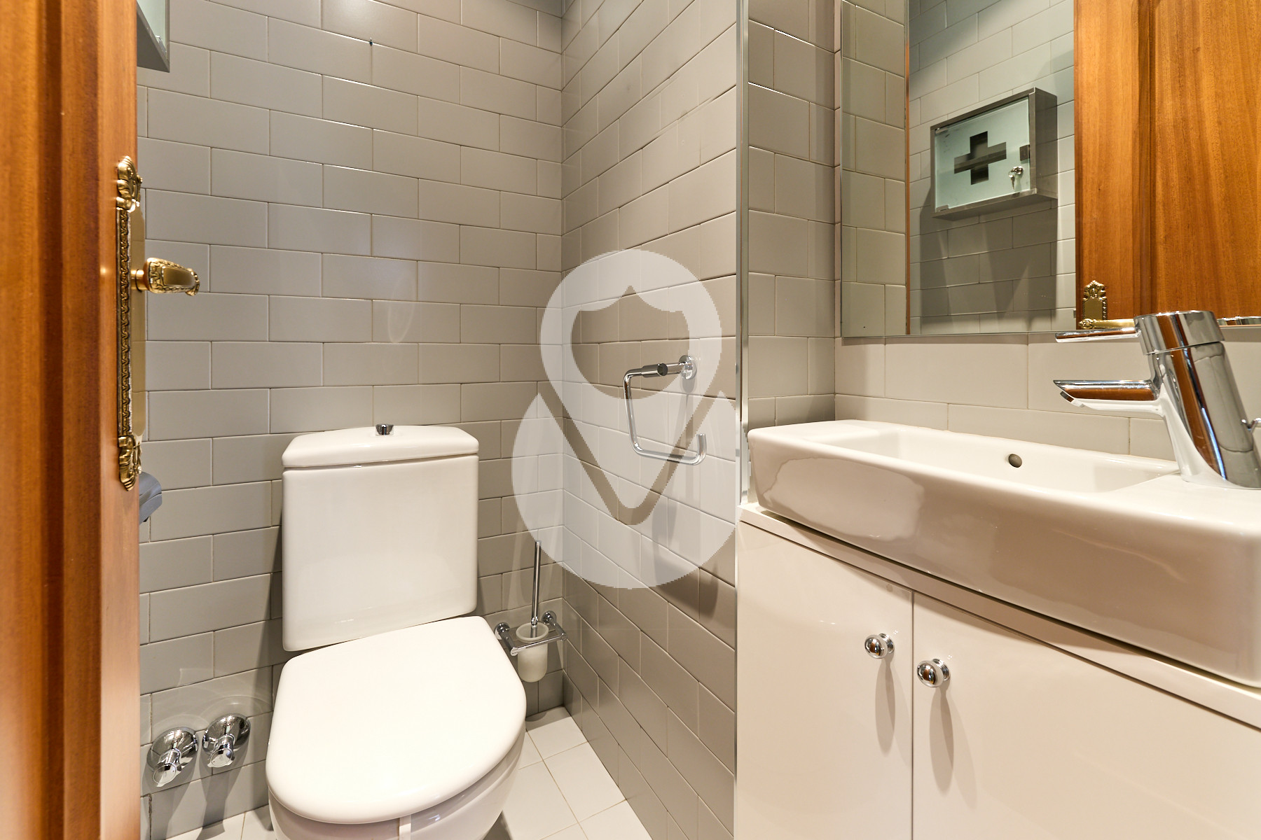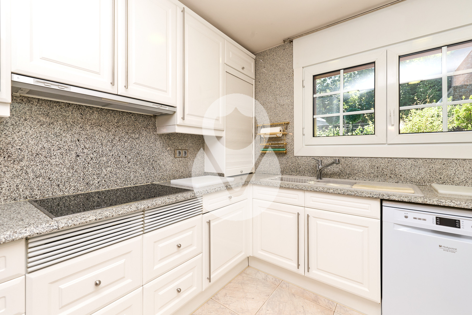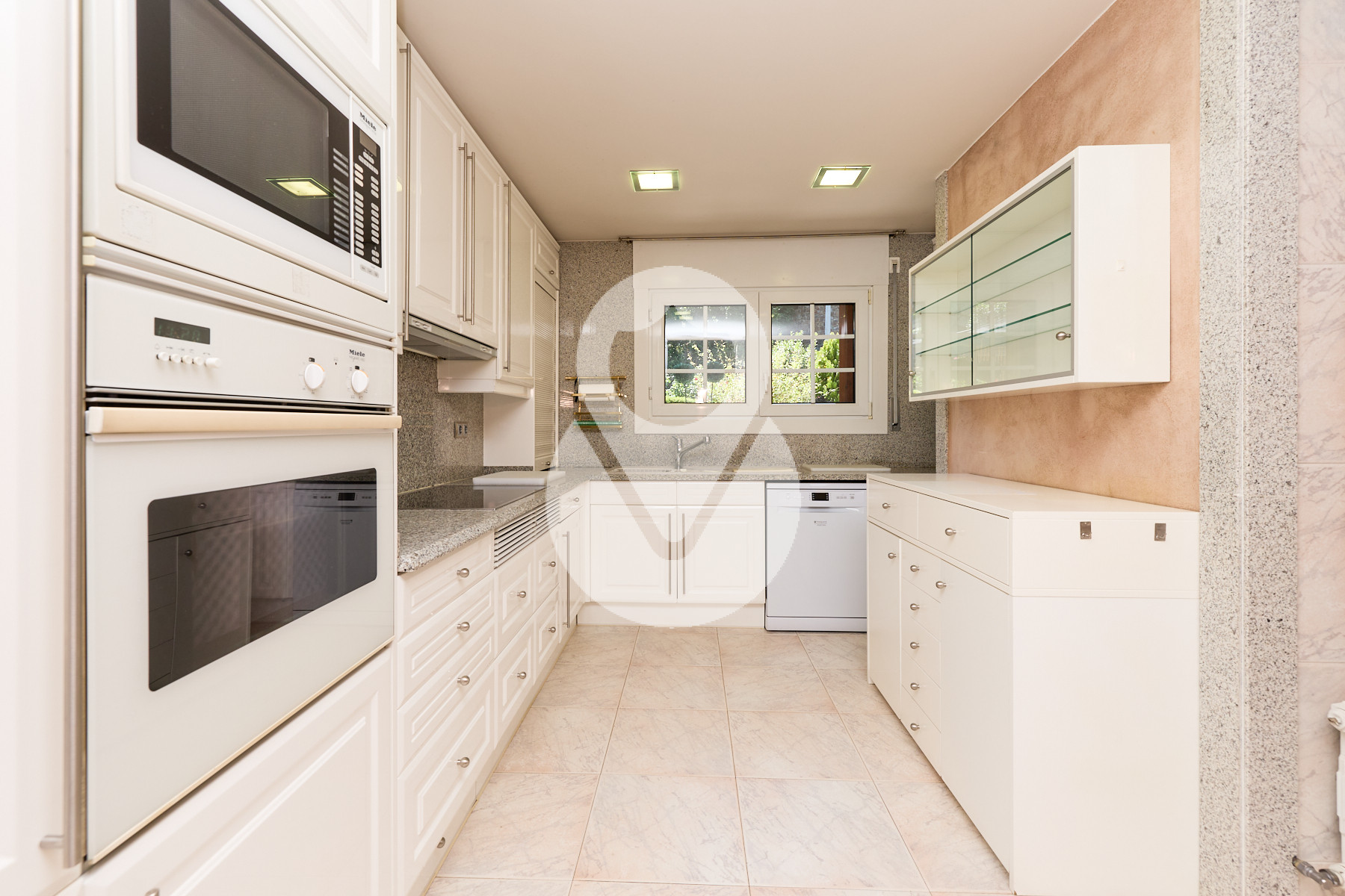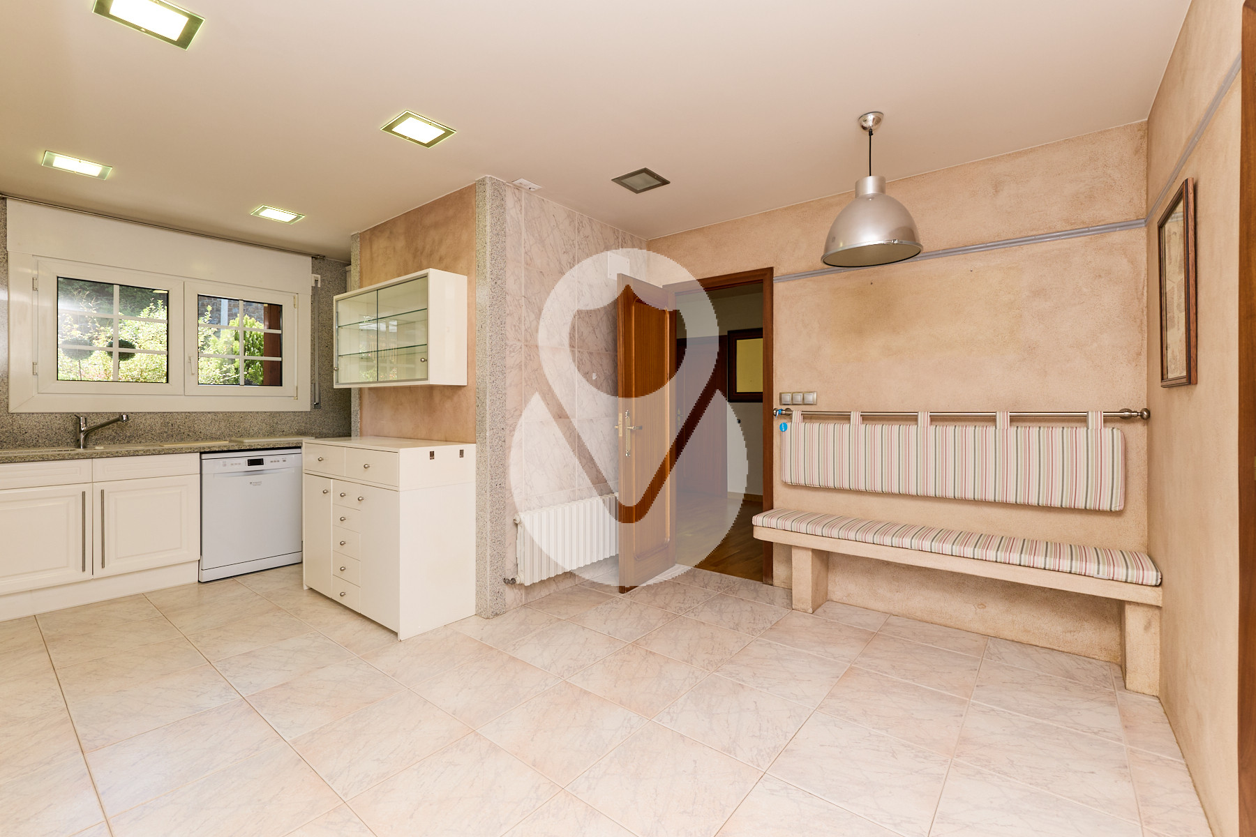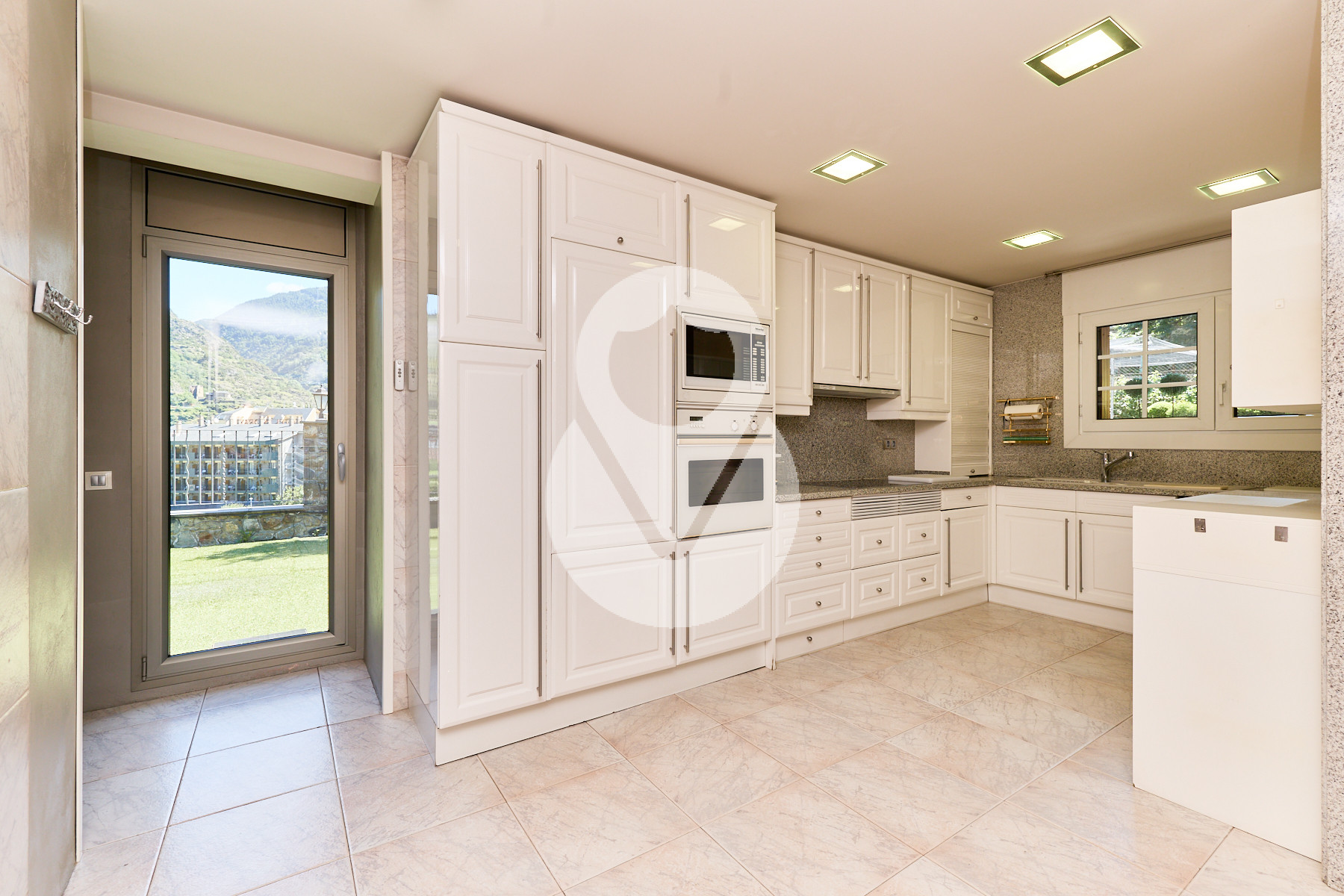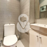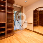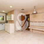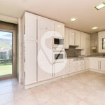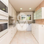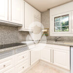 De nuevo en la planta baja, encontramos un aseo de cortesía, una amplia cocina cuadrada, totalmente exterior, equipada con ascensor que comunica todas las plantas y con acceso directo a la terraza. La cocina dispone de gran capacidad de almacenamiento, con múltiples cajoneras y armarios.