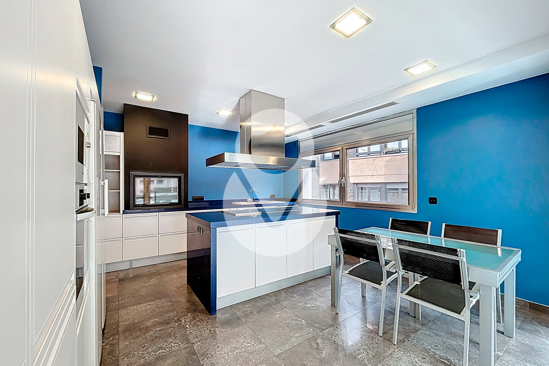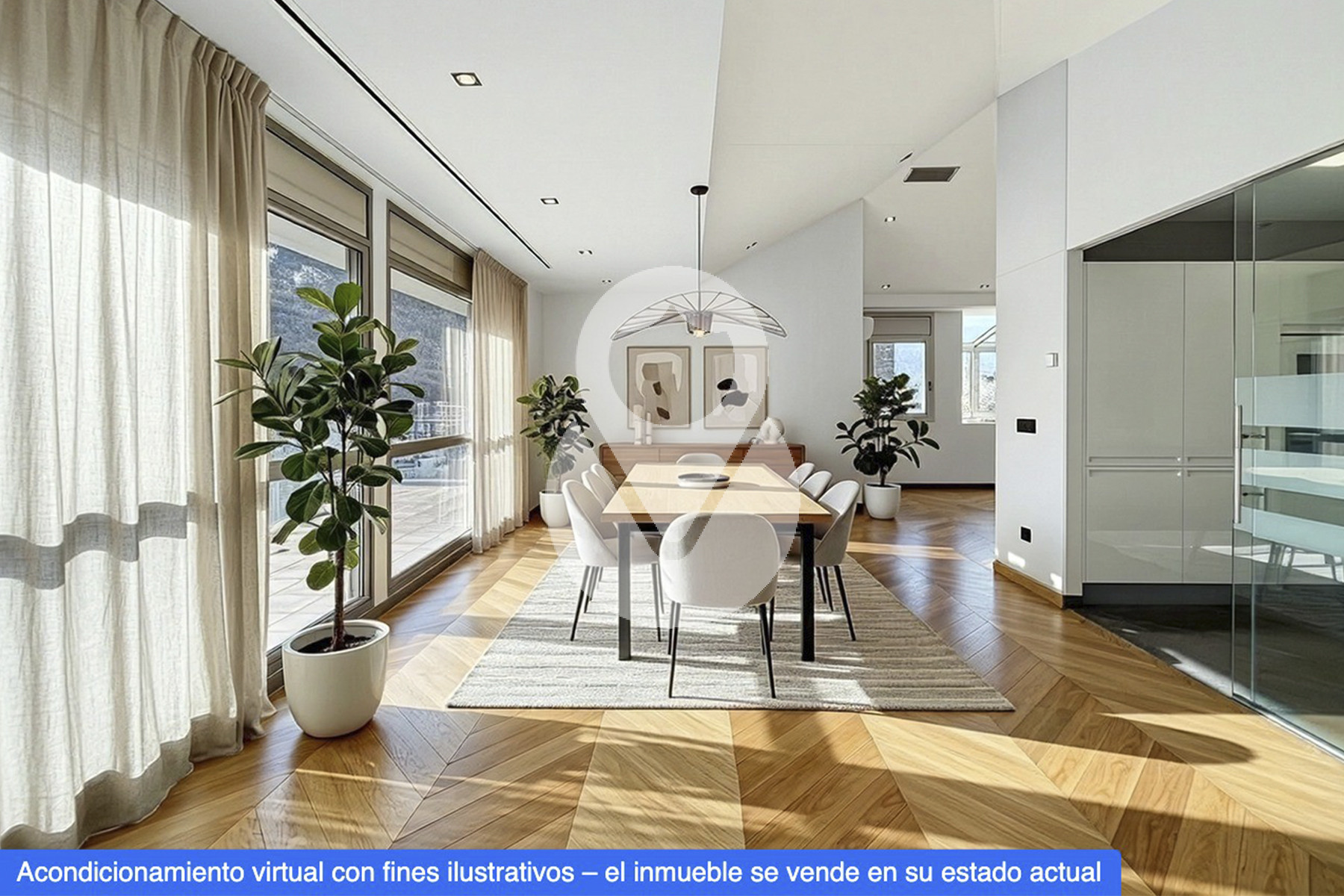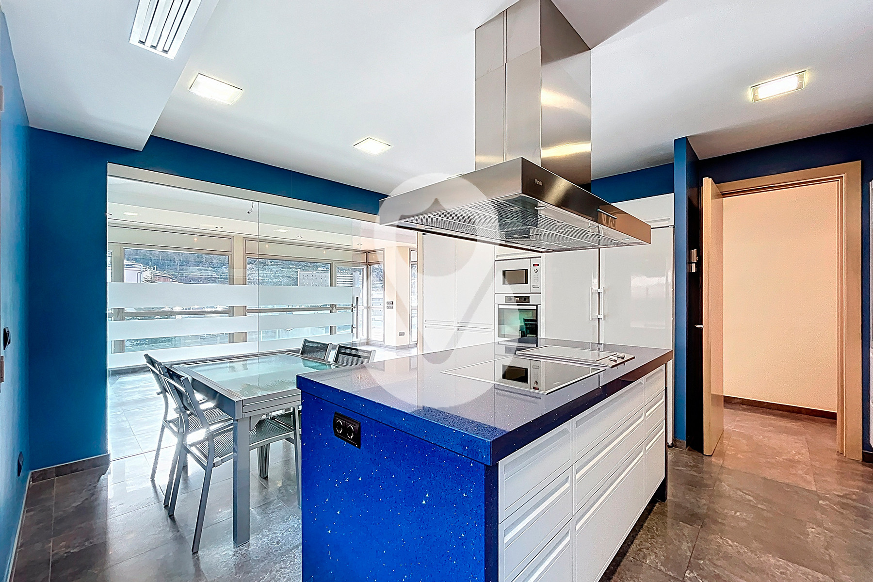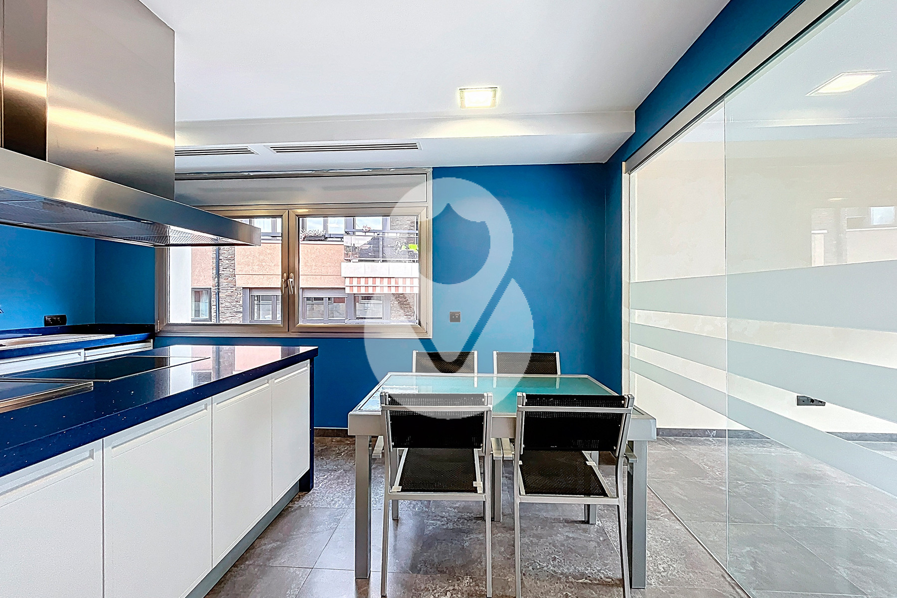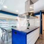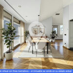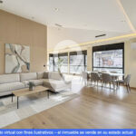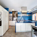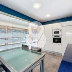 La zona de día se articula en torno a un sofisticado salón-comedor semiabierto, conectado a la cocina mediante una puerta corredera acristalada de diseño, que permite integrar ambos espacios o independizarlos, configurando una cocina tipo office de alta funcionalidad y estética contemporánea.