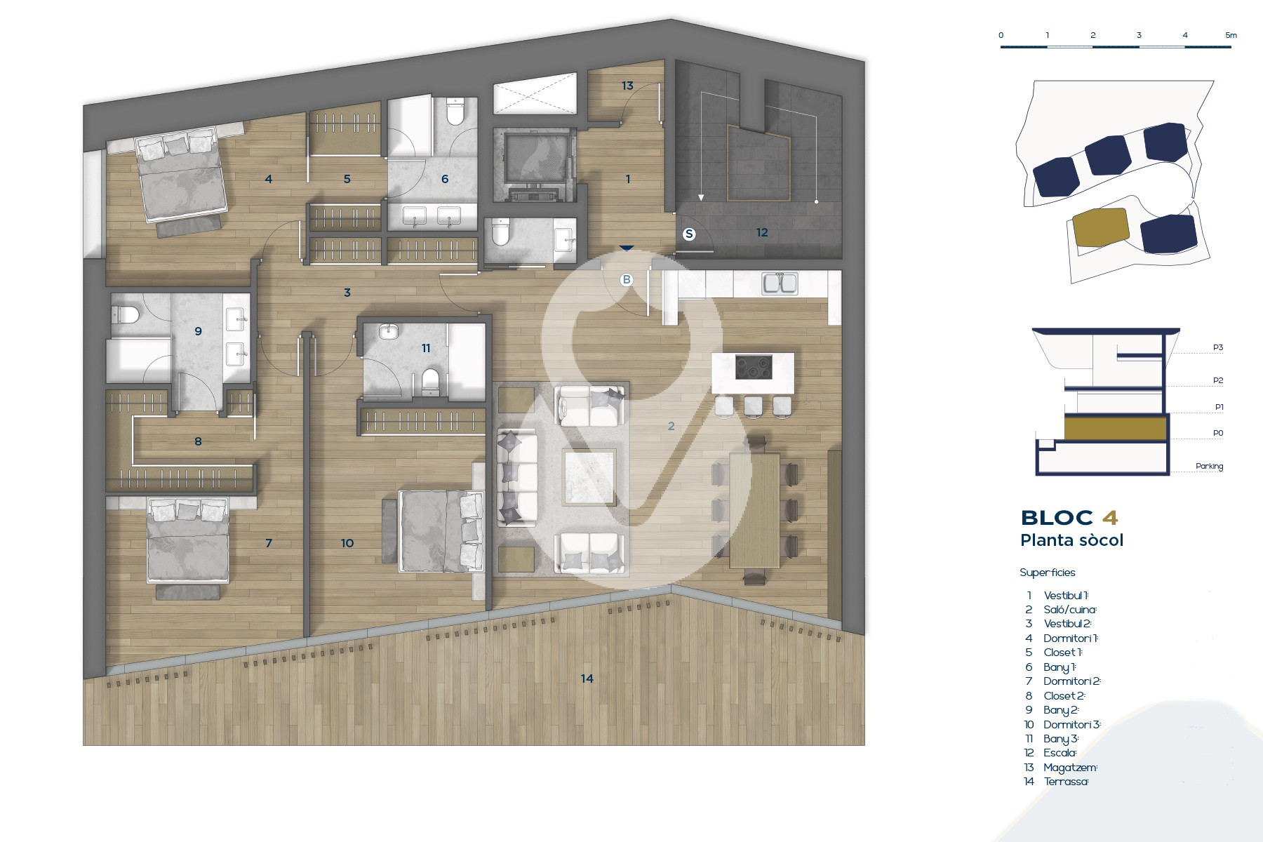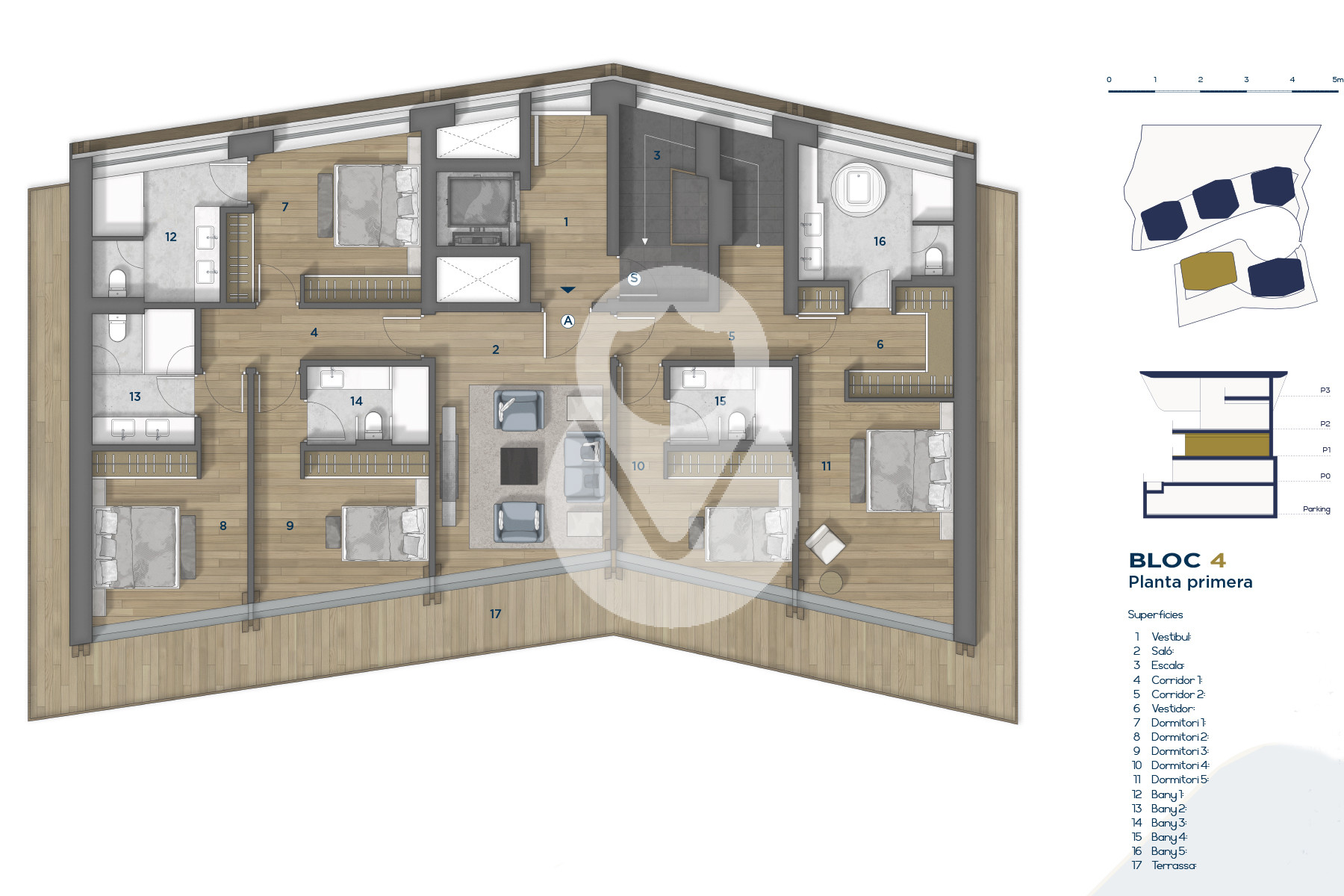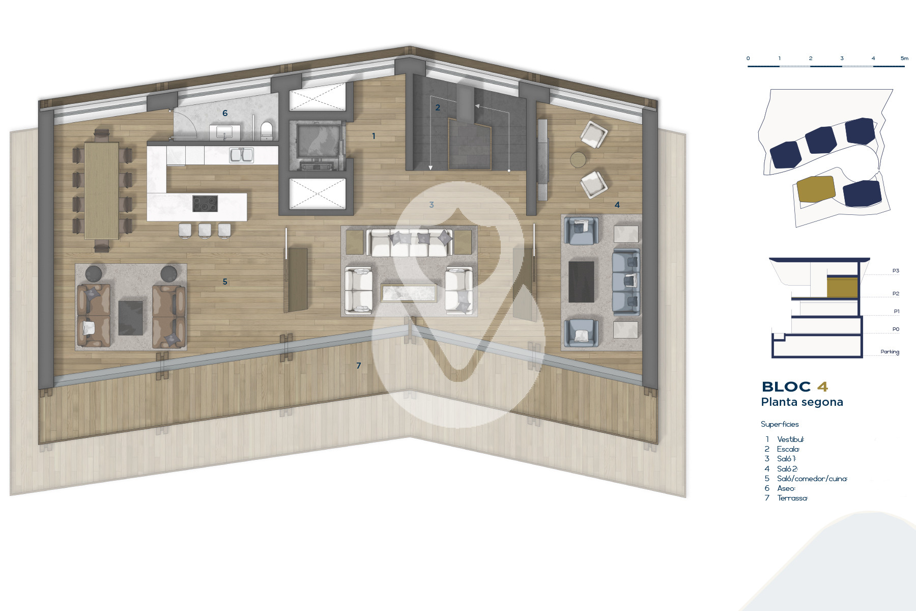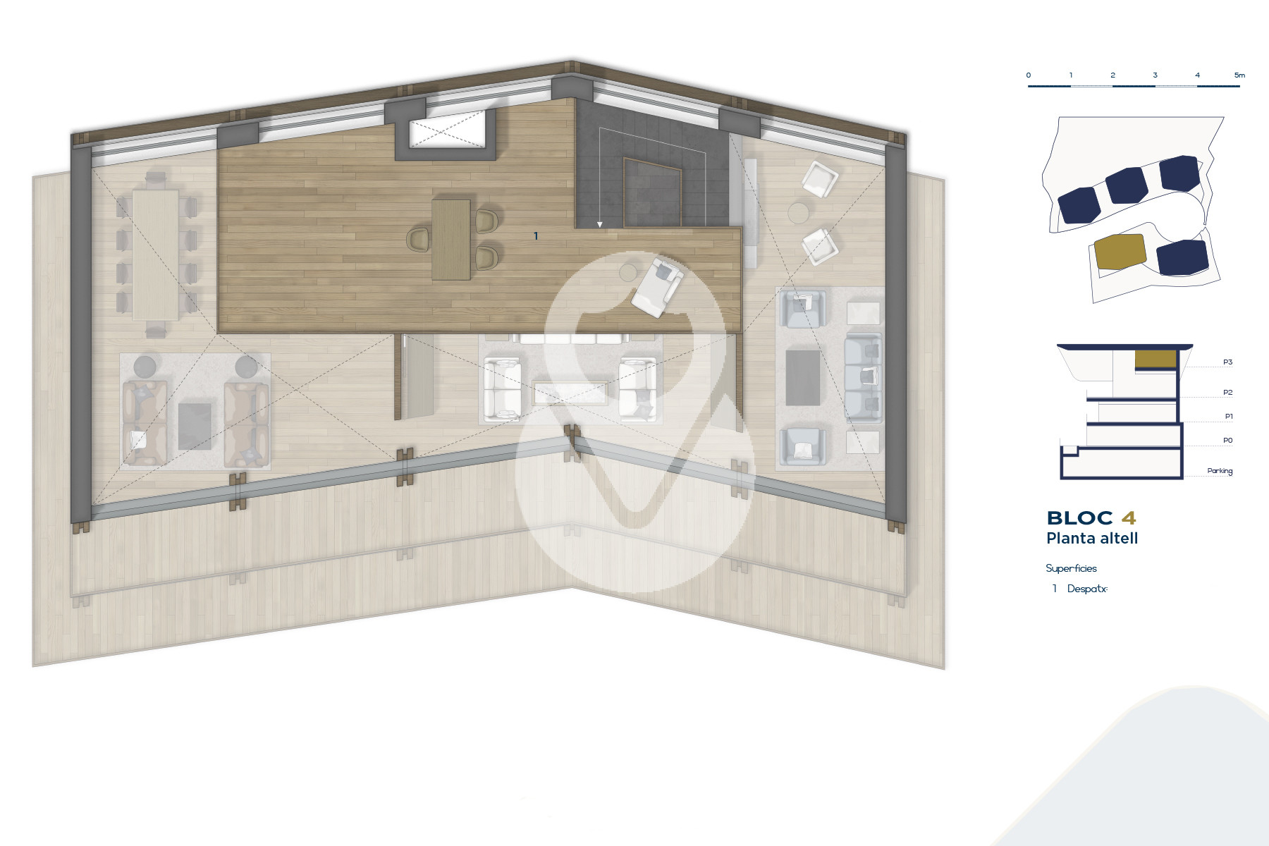 Se trata de un inmueble de nueva construcción de aproximadamente 669 m² construidos, los cuales incluyen múltiples terrazas orientadas de forma óptima para aportar la máxima exposición posible a la luz natural, y disfrutar a su vez de las magníficas vistas de Ordino y sus valles.