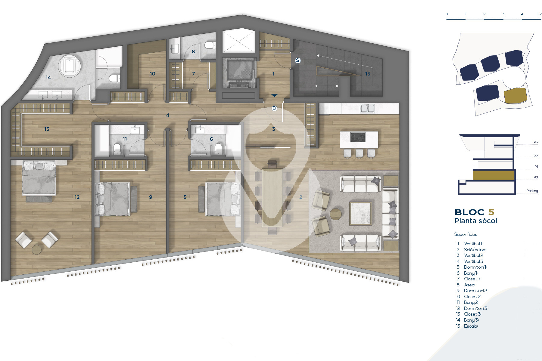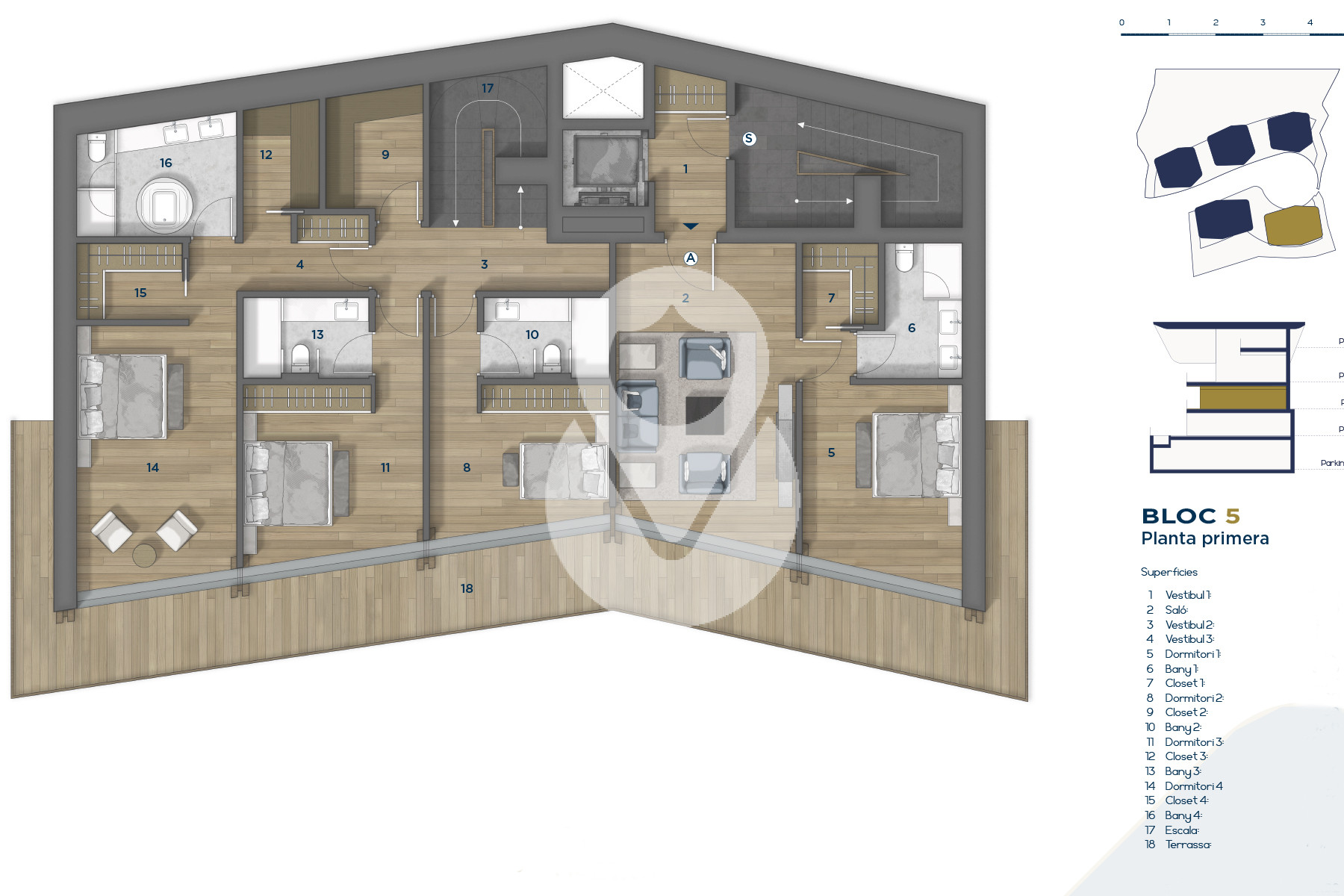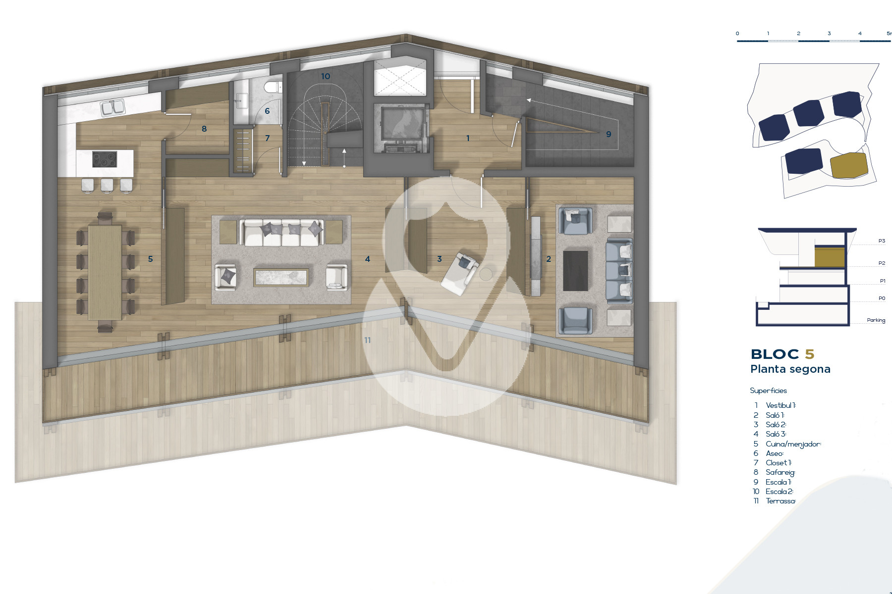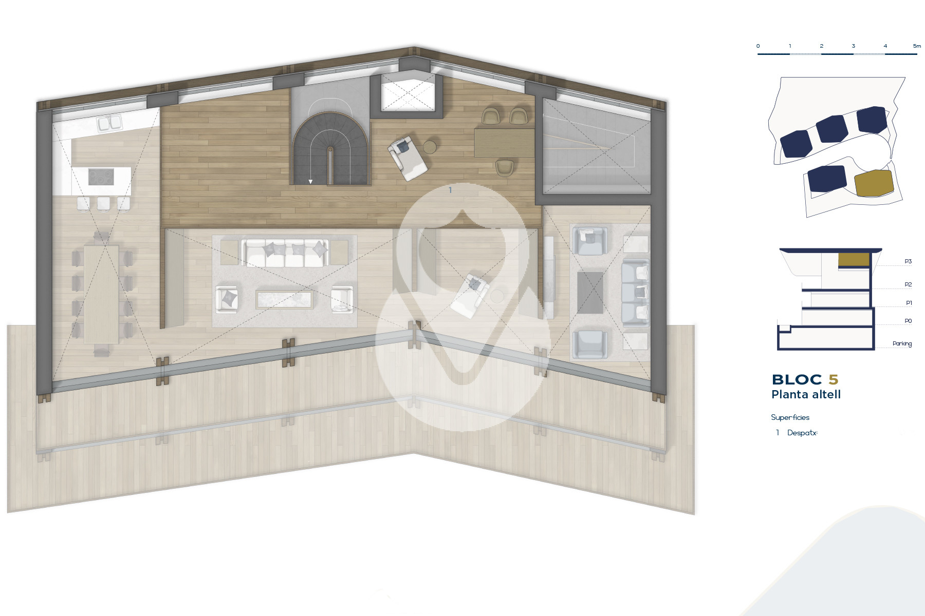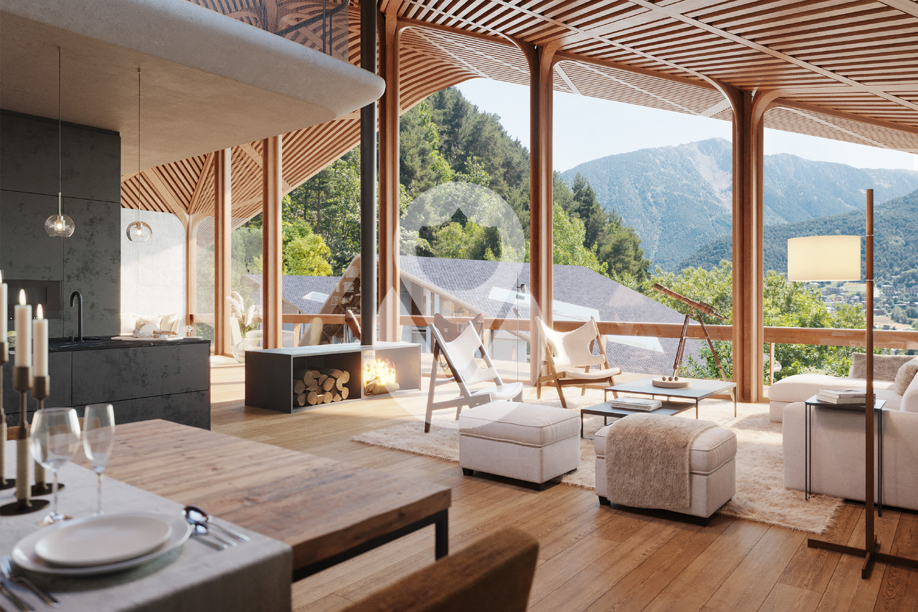 Se trata de un inmueble de nueva construcción de aproximadamente 669 m² construidos, los cuales incluyen múltiples terrazas orientadas de forma óptima para aportar la máxima exposición posible a la luz natural, y disfrutar a su vez de las magníficas vistas de Ordino y sus valles.