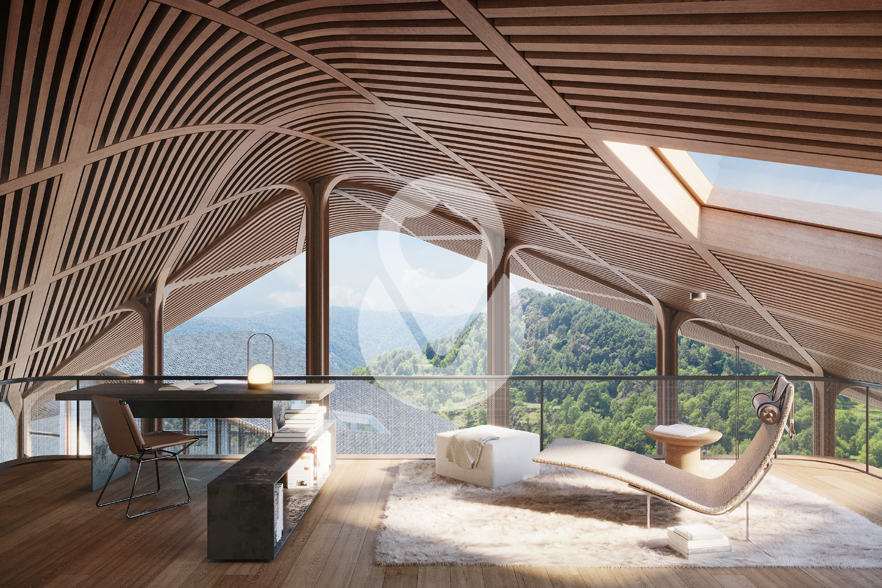 Los acabados son elegantes y de la más alta calidad, y el diseño de la propiedad combina elementos modernos, como las grandes vidrieras, con la clásica arquitectura andorrana en piedra y madera para integrarse de la mejor forma en el entorno y no perder la esencia del país.