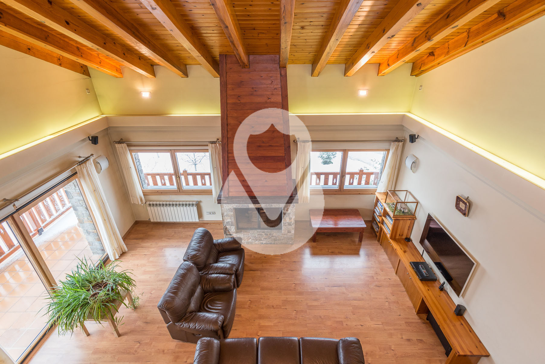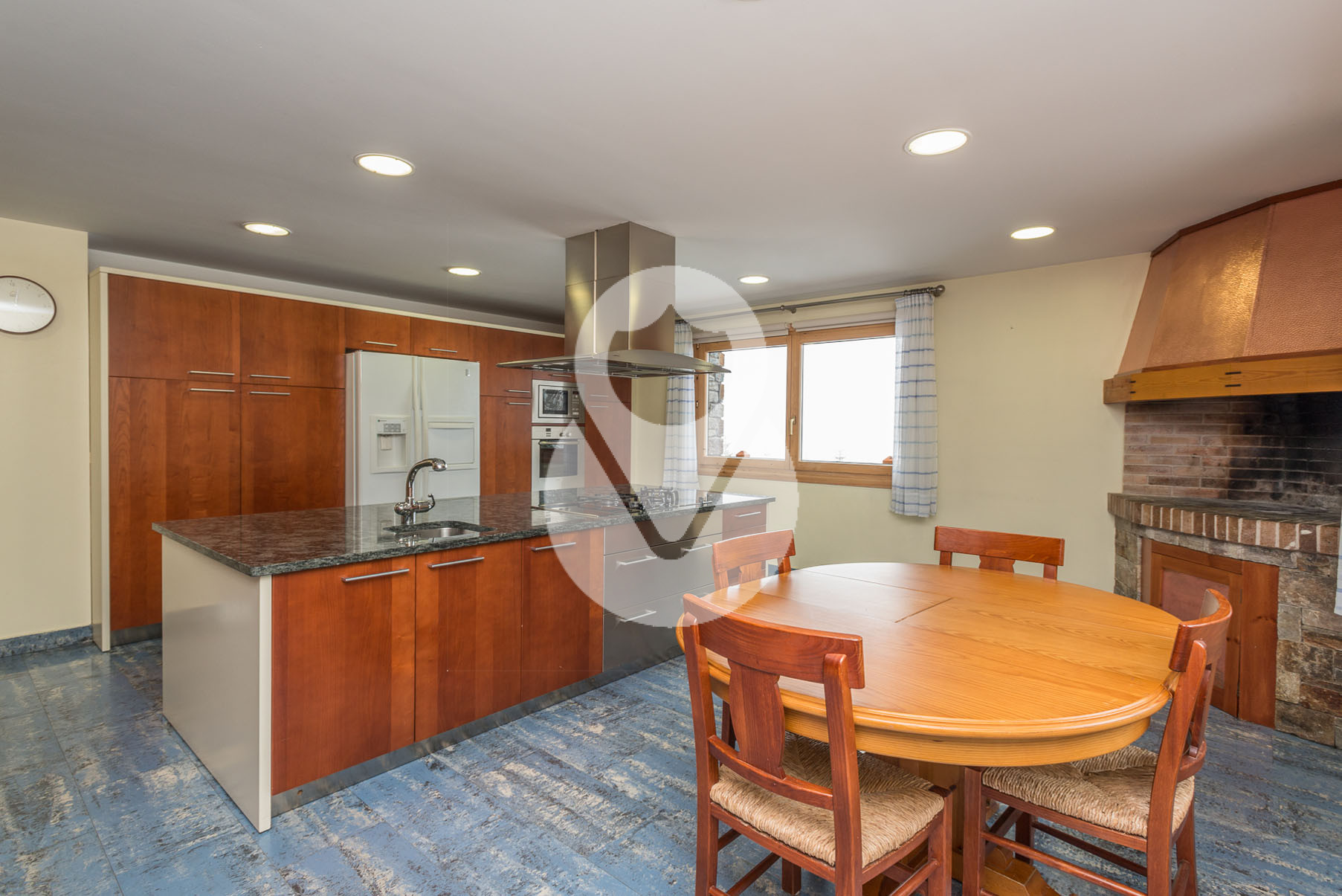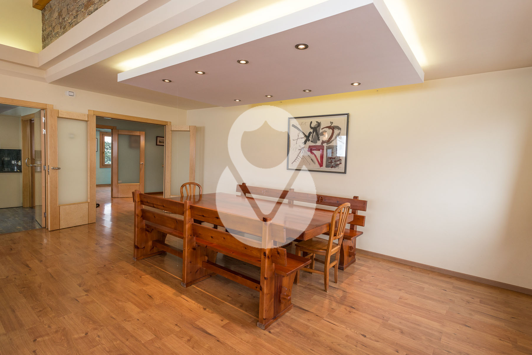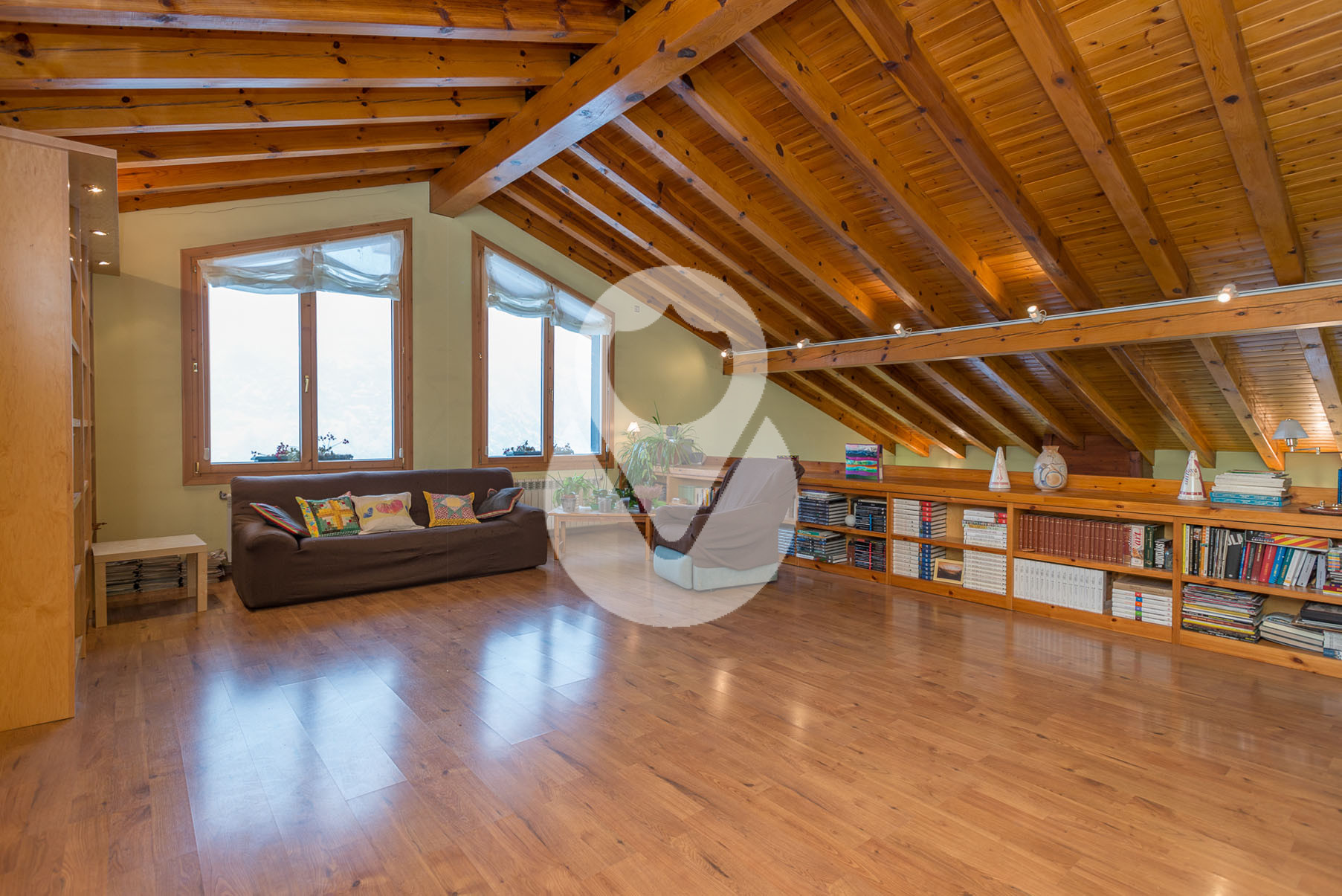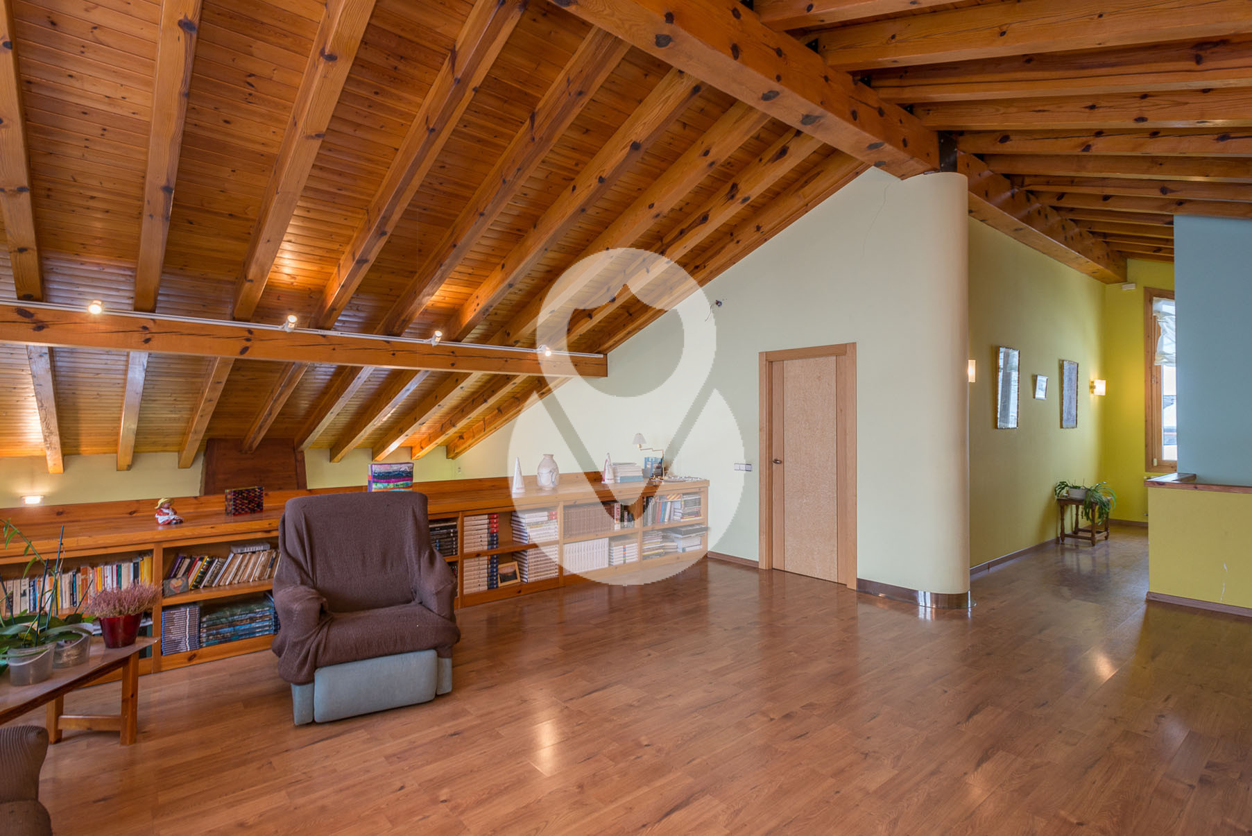 Dispone de 5 habitaciones dobles, una de ellas una suite con un gran vestidor y terraza. En la misma planta hay un gimnasio con sauna y una sala de lavandería. Tiene 3 baños completos y un salón comedor muy grande con amplios ventanales y chimenea de piedra.