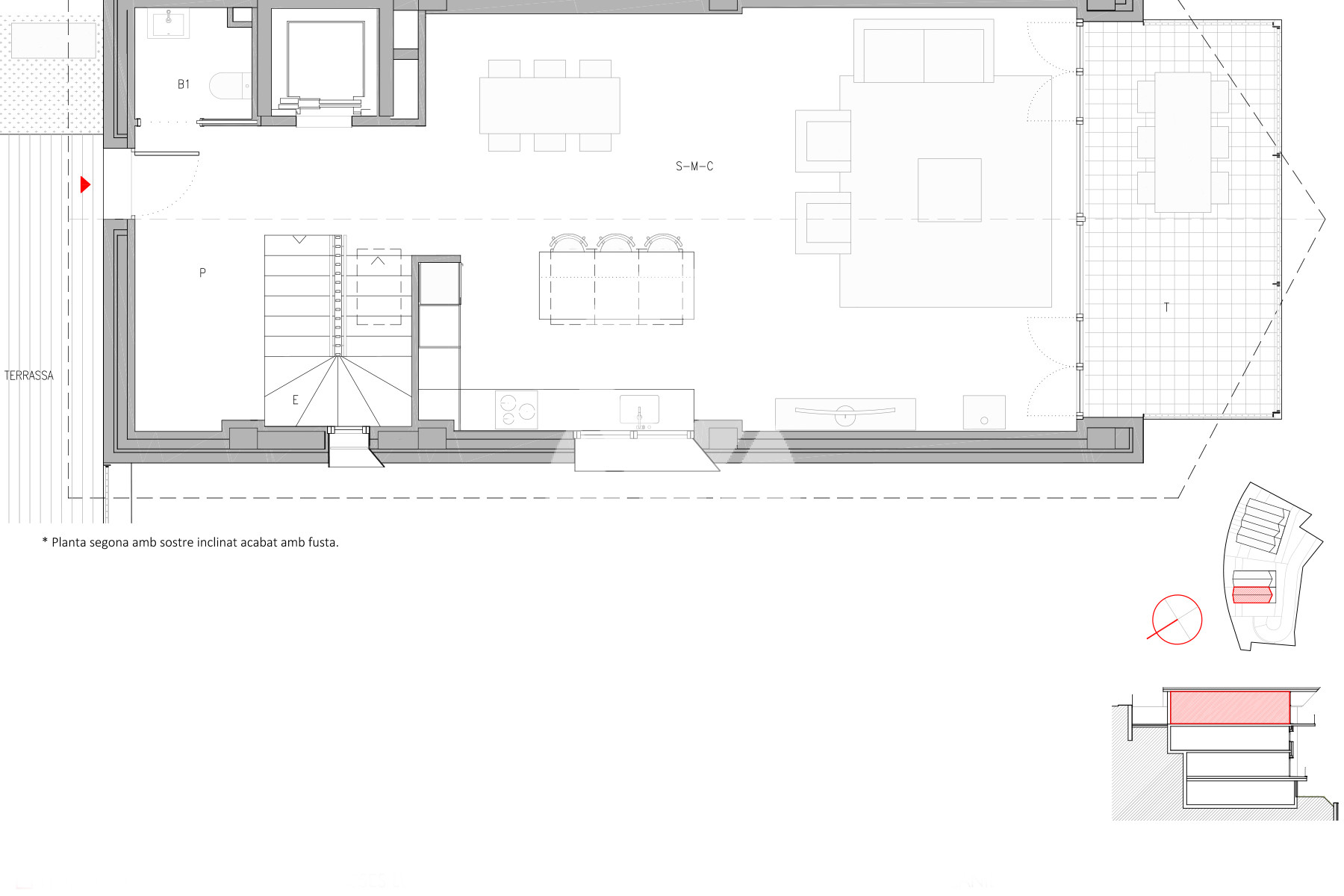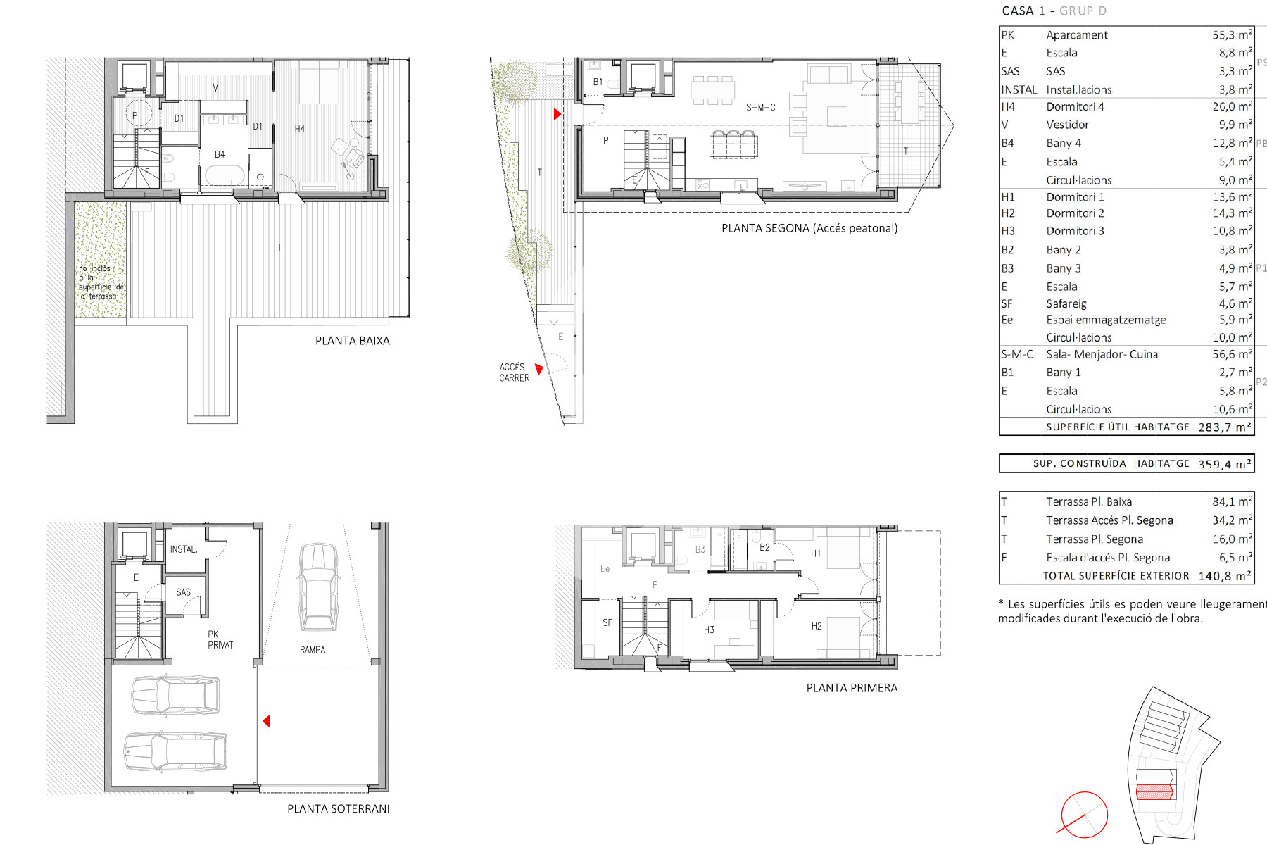 La vivienda cuenta con una superficie construida de 359,4 m², de los cuales 283,7 m² son útiles habitables, y una amplia superficie exterior de 140,8 m² distribuida en varias terrazas: una de 84,1 m², otra de 34,2 m², una de 16 m² y una escalera exterior de.