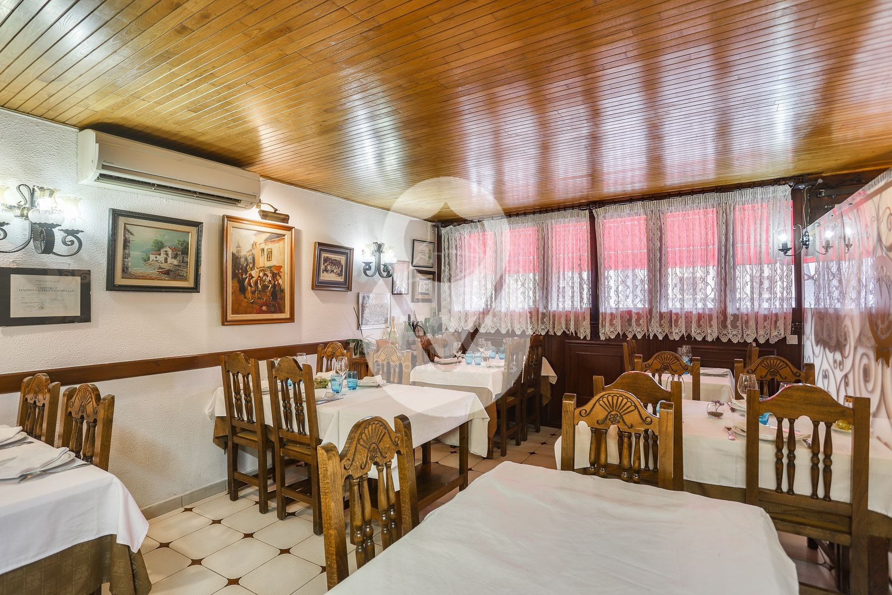 La sala del restaurante, equipada con climatización, está dividida en dos comedores separados, de 6 mesas cada uno, para una capacidad total de unos 45 a 50 comensales.
