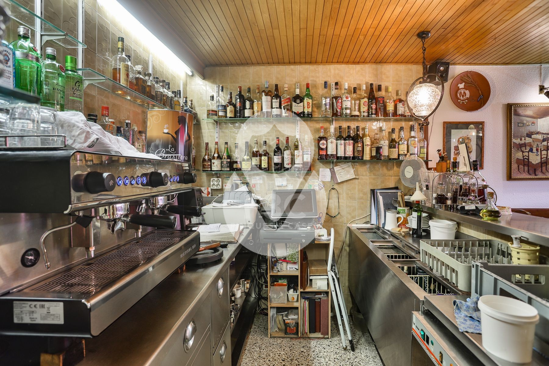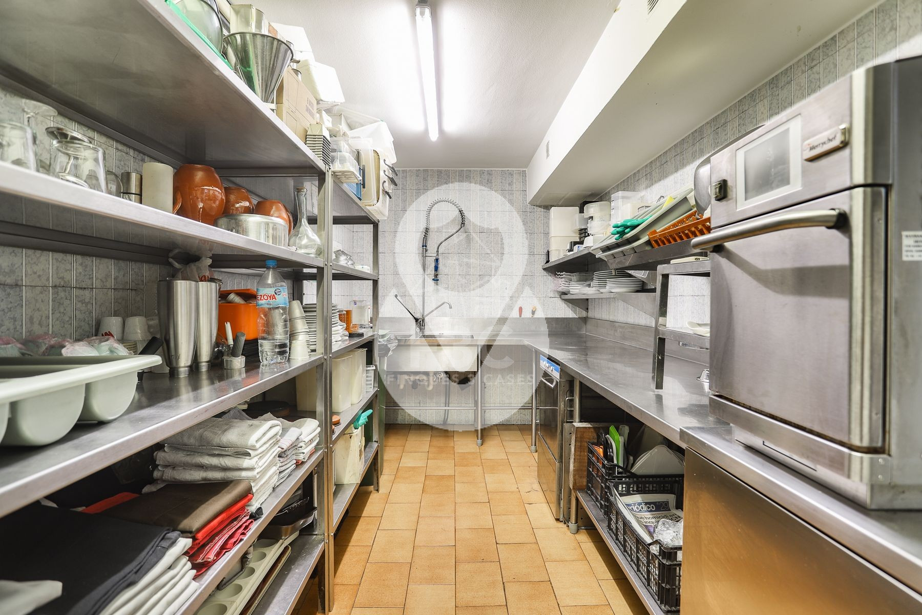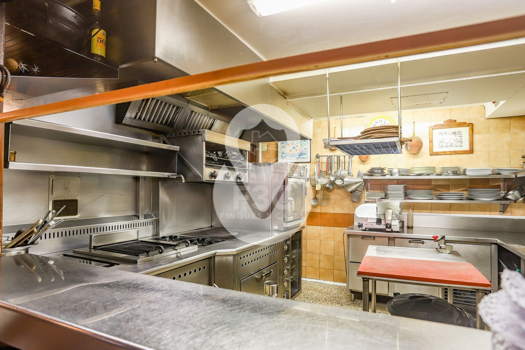 En la parte interior del local se encuentran los aseos, separados para hombres y mujeres, un área de lavavajillas totalmente equipada con lavavajillas y lavadero, congeladores, cámara frigorífica, sala de preparación preliminar con máquina de envasado al vacío y un despacho. También hay una sala técnica con la caldera propia del local, la lavadora y la secadora.