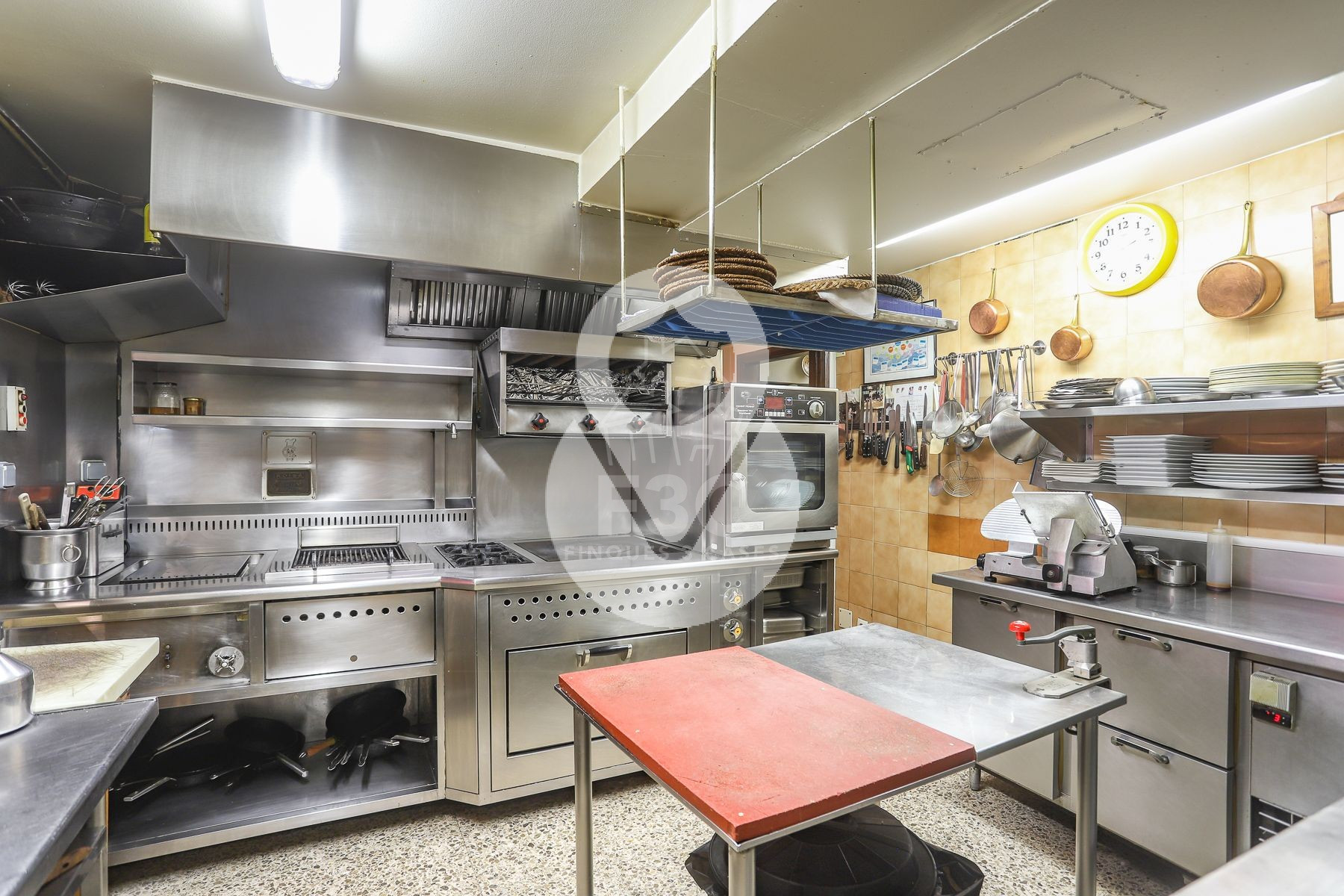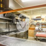Dispone de una cocina a la vista semi-abierta con barra pasa-platos, hecha a medida en 2012, totalmente equipada con, entre otros, fogones de gas y eléctricos, grill, horno combinado, espacio de trabajo separados para preparaciones frías y calientes, isla central y extractor de humos. También dispone de una zona para preparación de postres y de un bar con máquina de café y neveras.