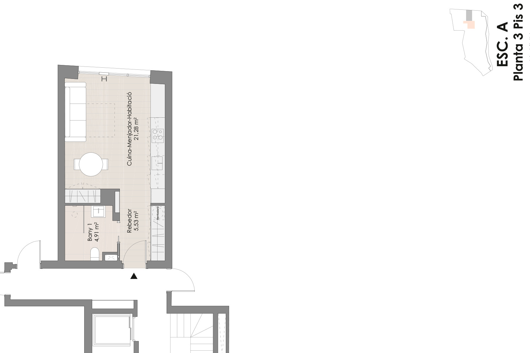 El Estudio tiene 37,51m² distribuidos en un salón comedor, la cocina, integrada en el comedor, equipada con electrodomésticos de gama alta. También hay un baño completo.
